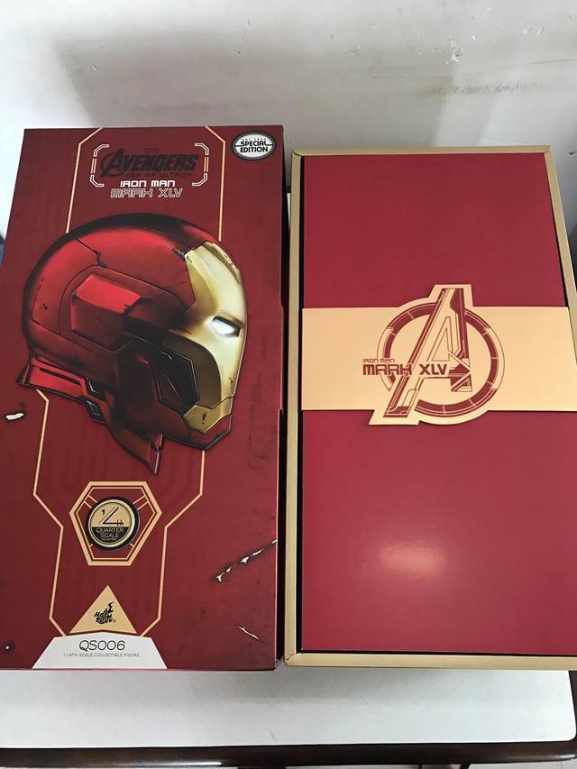不知道台灣的朋友是否收到貨品,由於香港首發,我已經開箱了。可惜香港部分網民對此給予劣評,價格跌破新低。主要原因是這隻1/4的鋼鐵人缺乏QS005 鋼鐵人43 的真人頭雕,配件較少(沒有導彈及兩肩的子彈發射器),缺乏43推出時的驚喜,被評為無誠意。由於1/6 鋼鐵人43做得不算完美,沿用42的身體,1/4 鋼鐵人43的驚喜卻很大,而且真人頭雕的光芒令整隻43有完美光環,價格亦很穩定。作為第一隻 HT 第一隻 1/4 ,在那時候是十分震撼!45相較之下失色不少,令期望過高者大失所望,甚至有1/4只是1/6的鋼鐵人45放大版一說。