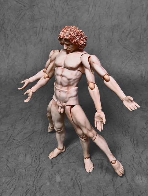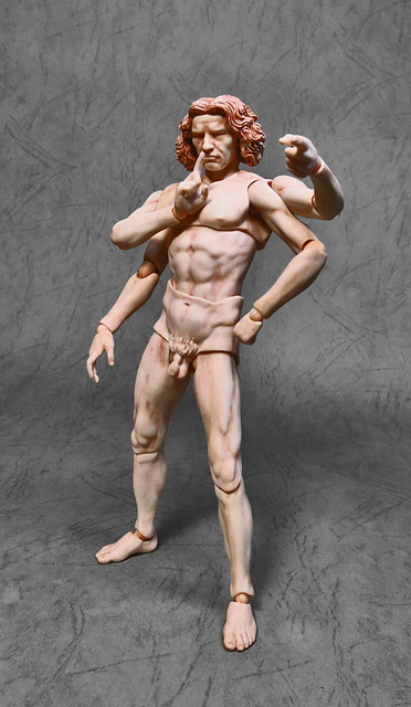 繼「沉思者」、「維納斯」、「大衛像」之後,figma「桌上美術館」系列最新力作「維特魯威人」終於登場了!源自於文藝復興大師李奧納多·達文西的素描手稿,這幅又被稱作《建築人體比例圖》的《維特魯威人》本是建築師馬爾庫斯·維特魯威·波利奧的構想,將人體與象徵宇宙的方圓予以重疊,完美和諧的比例至今仍讓人津津樂道。這回,figma的立體可動化可是讓收藏者們期待萬分,正經八百的堅毅神情、華麗的四手四腳及多樣化的手部配件完美地將畫稿立體重現,除了上下各兩對的特殊手腳,figma也很貼心地準備了一般版本的四肢和軀幹供玩家自由運用搭配,再配合figma同家的各種配件,這款「老維」絕對有機會成為惡搞系可動人偶的一代經典吶(?)