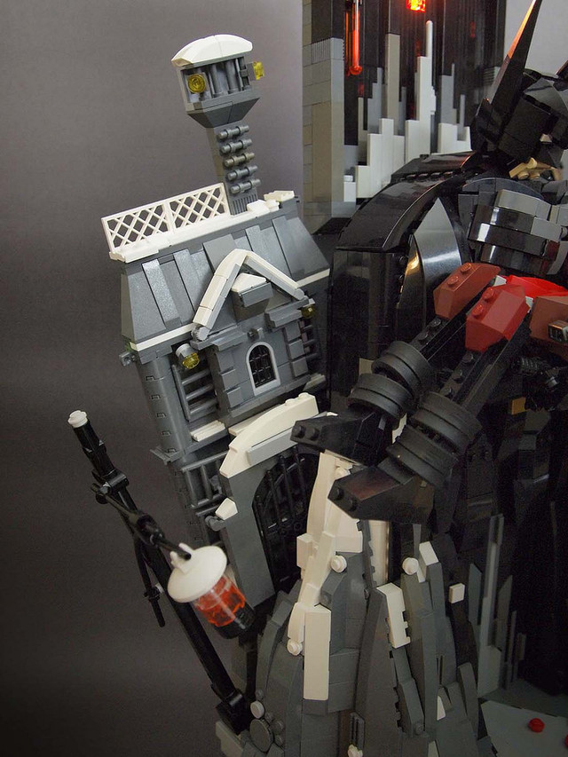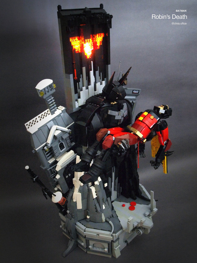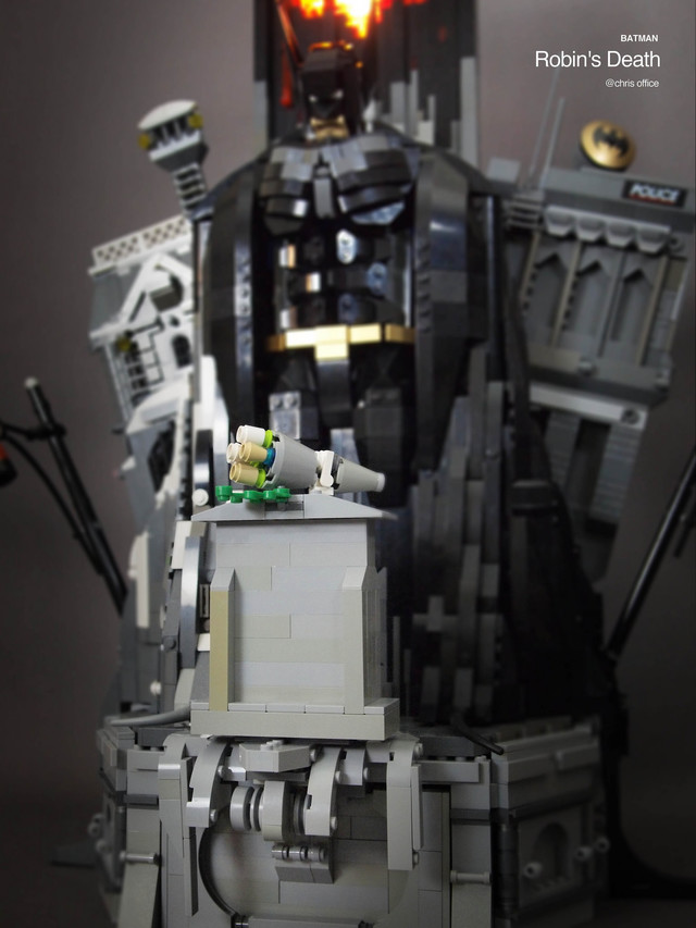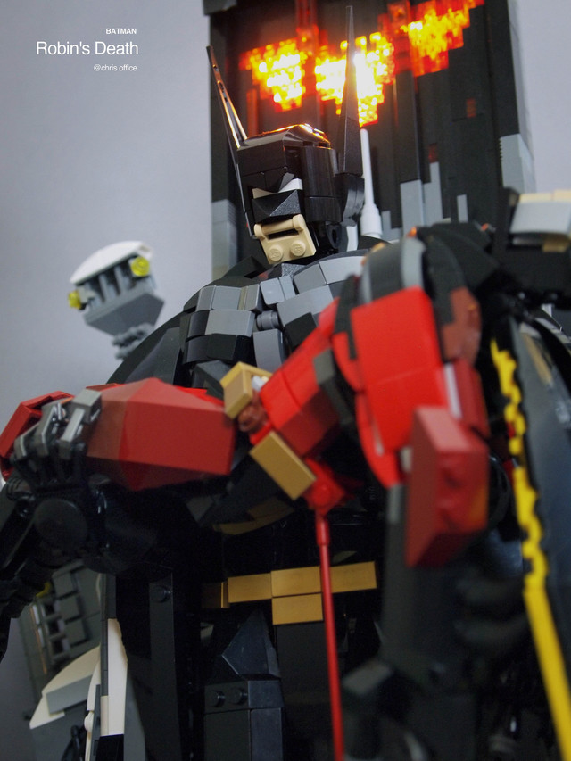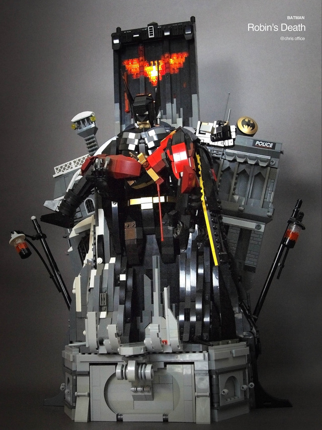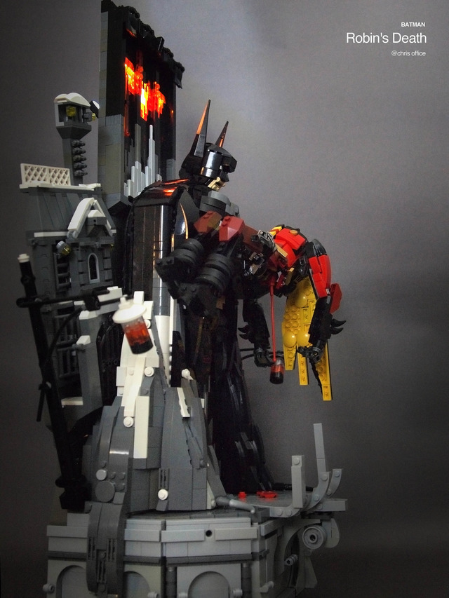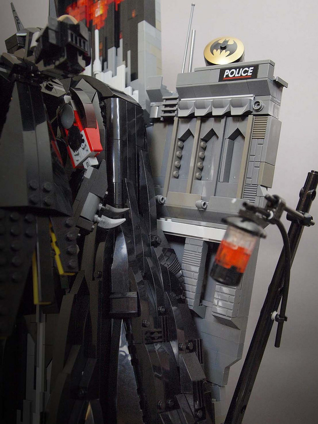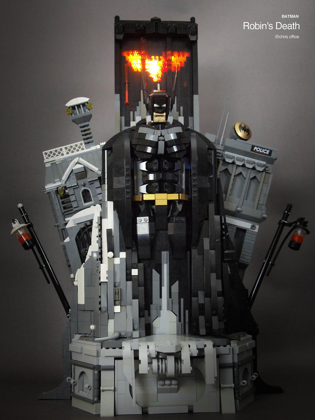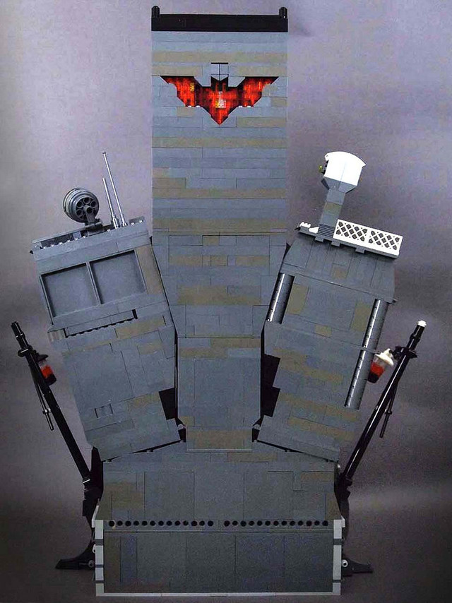 中央高起的背景以多層次的方式,做出高登市天際線,上方運用橙、紅色透明磚,加上後方打燈,呈現燃燒的蝙蝠符號(取材自蝙蝠俠:黑暗騎士)
