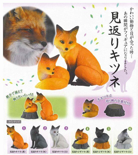 推出多款以動物為主題轉蛋商品的EPOCH公司,頗受到喜愛動物轉蛋玩家們的好評價,這次將繼續推出「回矇狐狸」見返りキツネ(名稱暫譯)的萌萌動物轉蛋作品,以療癒系動物"狐狸(キツネ)"為主要題材,加上將狐狸轉頭視線看後方的可愛模樣來製作呈現,預計將會推出大隻體型的狐狸和比較小的幼子狐狸兩種類,外加上三種不同的身上配色等等,所以總共有六種類的狐狸可以收藏,幼子狐狸還附有個樹木底座配件。
