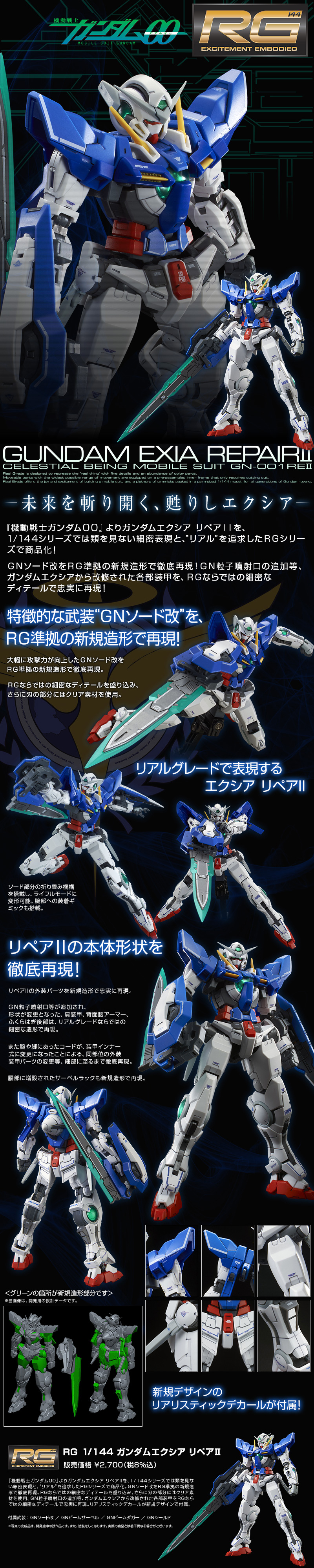 由日本BANDAI萬代玩具公司發行的眾多「鋼普拉(Gunpla)」系列商品中,將外裝甲、骨架、連動裝甲等技術融入1/144比例的「RG(Real Grade)」系列今(13)日發表了最新商品,來自《機動戰士鋼彈00》的「RG 1/144 能天使鋼彈R2」(RG 1/144 ガンダムエクシア リペアII)即將於中午12時於日本Premium BANDAI開放預購的消息。
