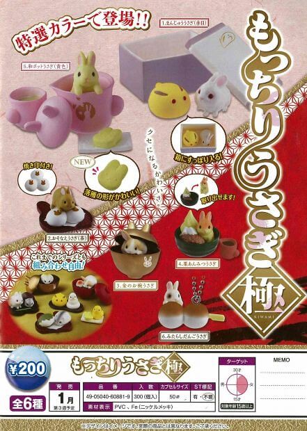 推出多款以動物為主題轉蛋商品的EPOCH公司,頗受喜愛動物轉蛋玩家們的好評價,以可愛兔子為題材已經推出過「日式和菓子兔」、「兔兔洋菓子本舗」、「搗麻糬兔」、「回萌兔」、「散歩小兔」和「靴子胖小兔」等等多款轉蛋的商品,這次將繼續推出相當逗趣又可愛的「日式和菓子兔(もっちりうさぎ 極)」的第三彈"極"篇章(名稱暫譯)。