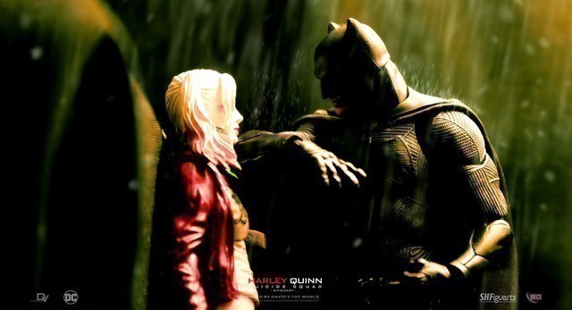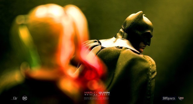 蝙蝠俠與小丑女走在一起,小丑女不斷在蝙蝠俠身邊講話:嘿!蝙蝠!為什麼你總是這麼嚴肅?