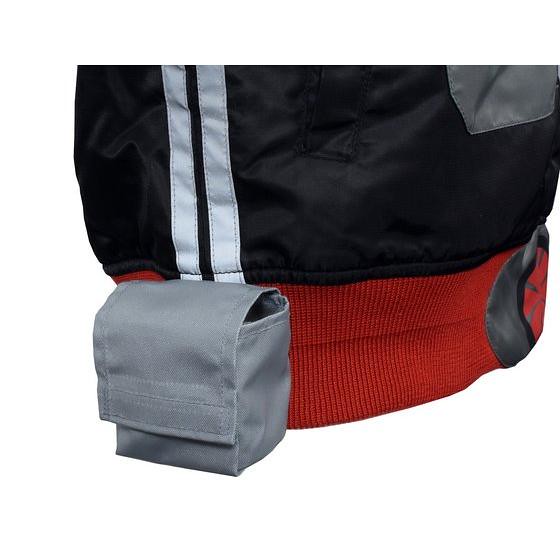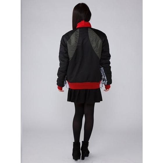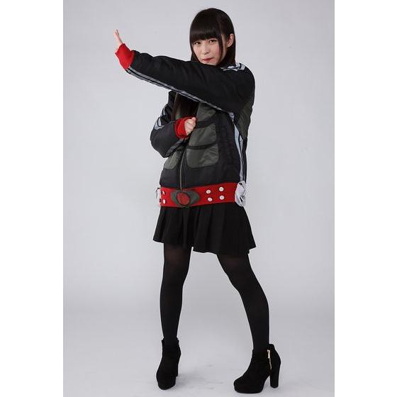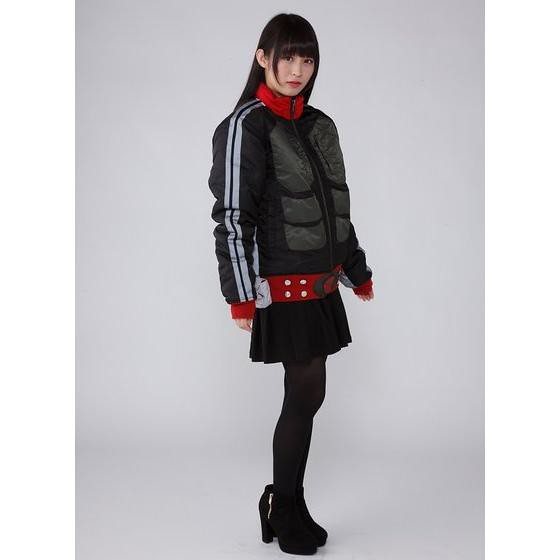 一樣在夾克外套的設計上附有紅色領巾和腰部側邊的小收納袋,夾克腰部的地放也印有假面騎士變身腰帶的圖案,夾克側邊和手臂側邊飾條使用夜晚反光材質呈現,照片中示範的女生是穿戴著紅色手套(袖リブ部はグローブカラーをイメージしたグレイ)商品的袖口會是深灰色,此作約會提供有M、L、XL、XXL四種不同尺寸可以供玩家選擇購買,預計於魂web線上商店在2017年1月18日開始接受訂購,這款外套可以讓你快速變身為假面騎士新1號,喜愛《假面騎士》系列的玩具人可以參考一下歐!