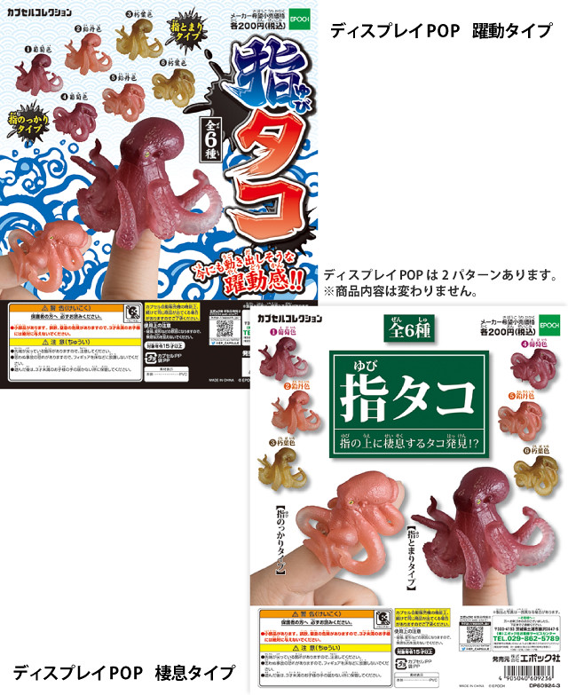 推出多款有趣動物轉蛋的EPOCH品牌預計這個月份推出「指上章魚」的趣味轉蛋作品(指タコ)名稱暫譯,之前所推出過的「指上的變色龍」、「指上的小飛鼠」、「指上的燕子」以及「指上的鸚鵡2」等等的指上動物系列都十分受到喜愛動物轉蛋的玩具人們好評價,這次將以特殊的軟體動物「章魚」為題材推出,預計將推出兩款不同造型的指上章魚,每款各有三種不同配色所以總共約會有六種類可以收集。