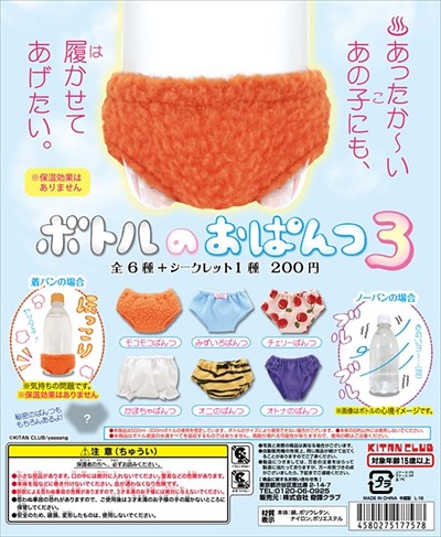 擅長推出許多令人意想不到轉蛋作品的日本玩具品牌「奇譚俱樂部」(KITAN CLUB)繼推出了第一彈、第二彈的飲料專用內褲之後,奇譚俱樂部又將要推出這第三彈「飲料專用內褲?!」(ボトルのおぱんつ3)的作品啦!以少女風格超可愛的小褲褲風格融入有點實用又不太實用的飲料底部吸水概念中,實在是非常可愛啊!