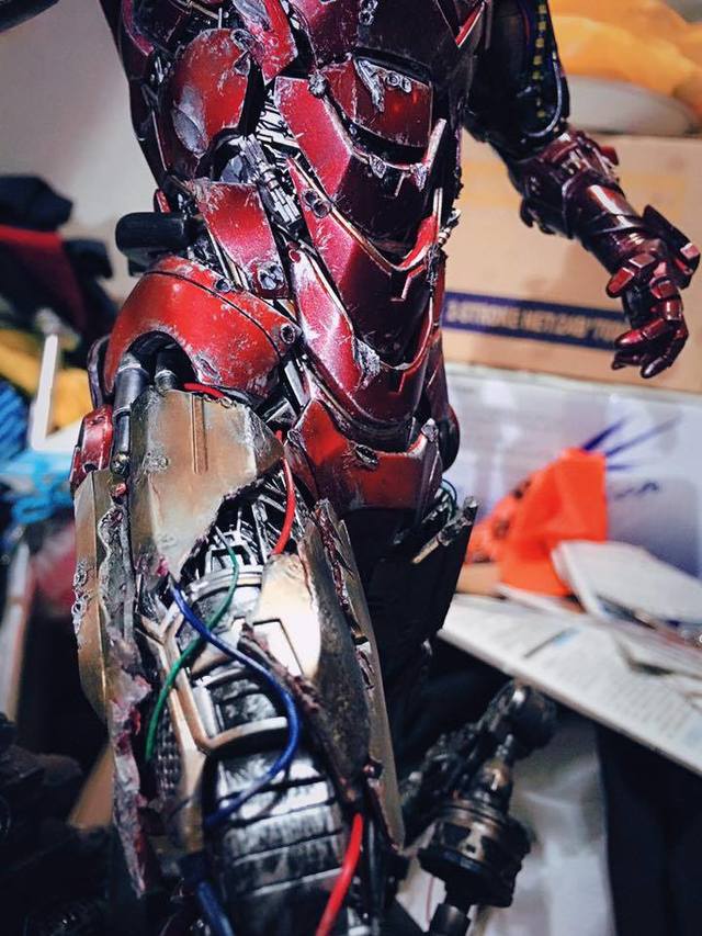 使用鬼骨最大的好處就是頭部能做出最英雄的低頭暗沉姿勢、任意擺動,讓雕像的不可動度噌天靈魂初始感。為了不讓這次改造出現原本割裂的塑膠感太重,所以在破損戰甲邊縫部分,也做了漆面塗裝程序,讓鬼骨與MK-6 的體膚結合得更完美無缺。