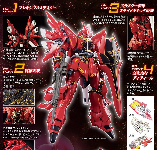 新安洲是少數非鋼彈但擁有超高人氣的機體之一,能夠被RG化也是順理成章的,除了保有RG系列一貫以來的內骨架、高可動、精緻細節等高水準表現之外,這次最令人印象深刻的是「帶袖的」金色紋章與黑色基底之間的雙層套色零件,不必塗裝就有絕佳的質感,光澤感十足的紅色裝甲也相當令人滿意。
