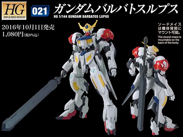 《機動戰士鋼彈 鐵血孤兒》第二季主角機天狼型獵魔鋼彈,和第一季比起來線條更加銳利華麗,武器也跟著升級,但價格其實和第一季一模一樣,加量不加價,比全國電子還甘心。肩上的鐵華團紋章一整個潮到出水,重劍型矛鎚也帥到沒話說,如果搭配武器包的話更是效果加倍,看過動畫的朋友就知道,打MA時的女武神破壞劍武器包(送1/144轉生式荷姆薇潔一架)是一定要入手的。