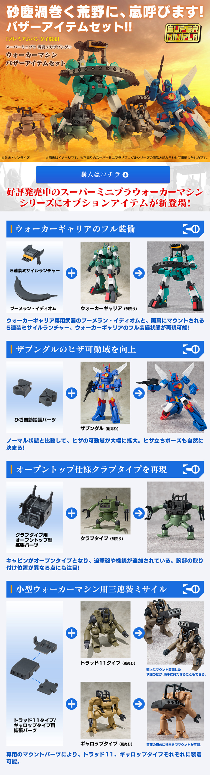 日BANDAI萬代玩具公司的食玩部門事業部新款「超級迷你盒玩」(スーパーミニプラ/SUPER MINIPLA)系列(名稱暫譯),首波已經推出早期動畫作品「戰鬥裝甲Xabungle」,第二彈是「傳説巨神IDEON」,第三彈則是《戰鬥裝甲Xabungle》動畫中的二號機「戰鬥機械渥克凱利亞」、第四彈「勇者王GaoGaiGar」還有第五彈的「進化合體 大獸神」後,官方近日公開將在魂web線上商店推出「戰鬥裝甲Xabungle 擴充用武裝配件組(戦闘メカザブングル ウォーカーマシンバザーアイテムセット)名稱暫譯」。