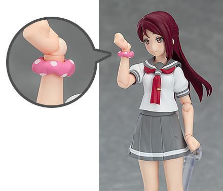 配件則有掛著小吊飾的「書包」、代表色櫻色的「啦啦隊彩球」、偷偷買了不能讓人知道的東西的「塑膠袋」,配合figma特製的關節與造型手掌就能擺設出各種場景!還附有能再現動畫ED的「替換用赤腳零件」!