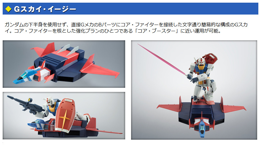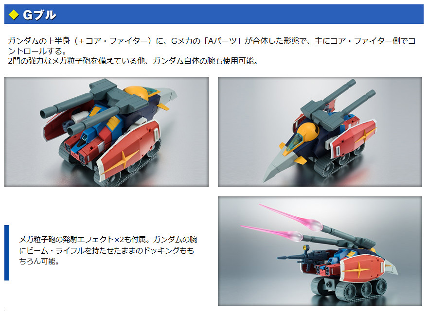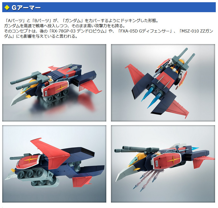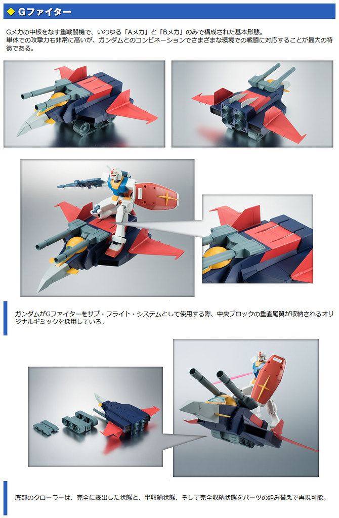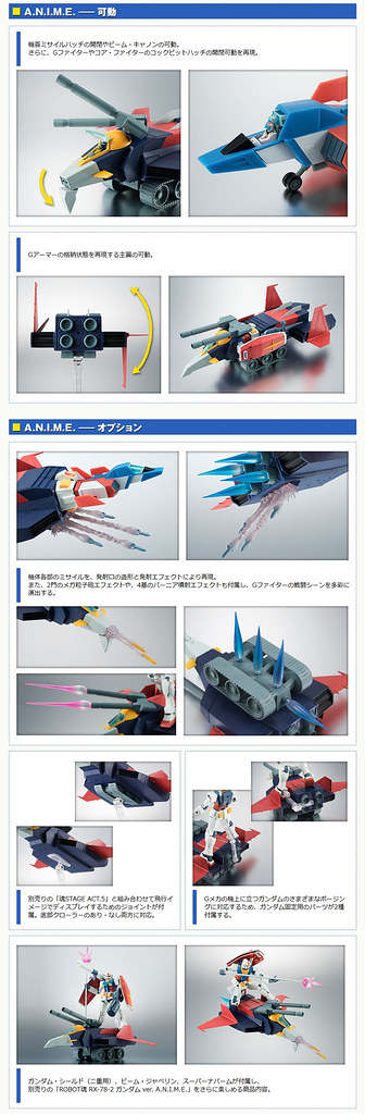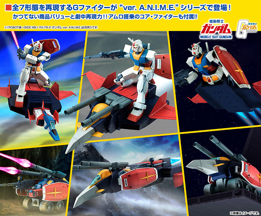 以重現1979年動畫造型為賣點的ROBOT魂暢銷系列「ver. A.N.I.M.E.」,宣布最新作將推出強力武裝「G戰機」,搭配上首波推出的ROBOT魂 – RX-78-2 ver. A.N.I.M.E. ,將能夠完整重現包含G武裝(G-Armor)在內的全7種型態! 並將附屬能夠重現原作中多種姿態的特效零件~