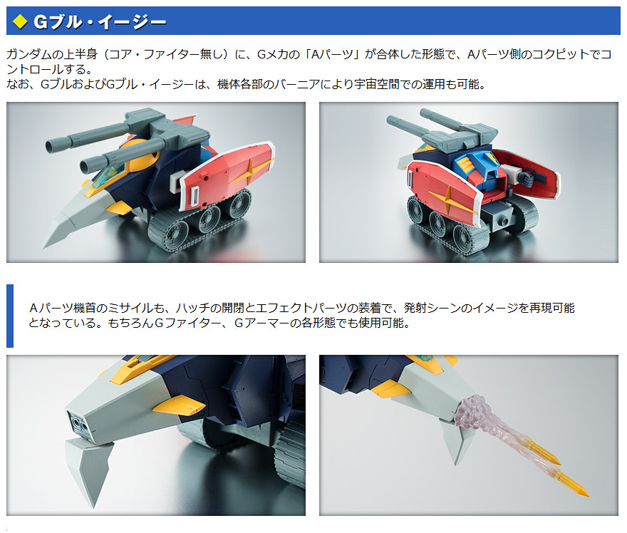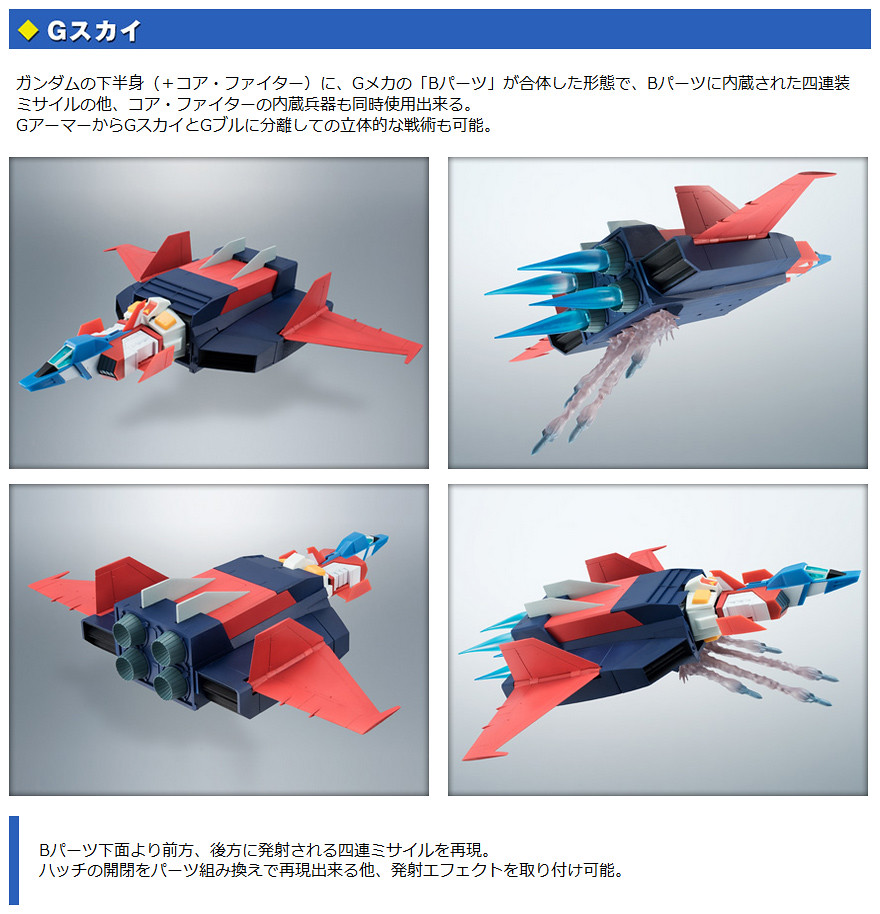 這次所發行的ROBOT魂 G戰機 ver. A.N.I.M.E. 除了能夠精彩重現原作中完整的各種型態之外,還附屬了動畫中出現的四連裝火箭裝置、機頭火箭裝置、光束加農砲射擊特效與飛行噴射效果零件;另外還附有光束戟、盾牌與超級燃燒彈作為配件,搭配ROBOT魂 – RX-78-2 ver. A.N.I.M.E. 將會樂趣倍增!~