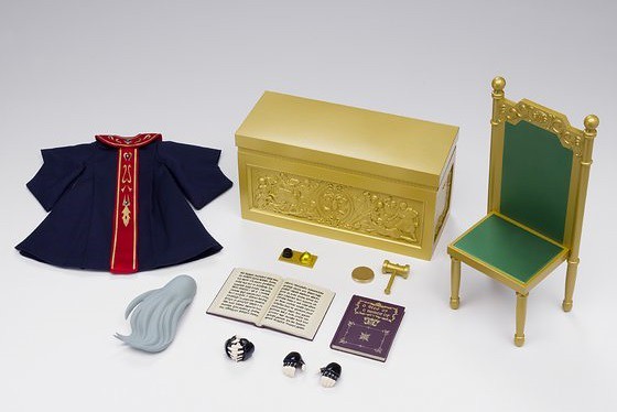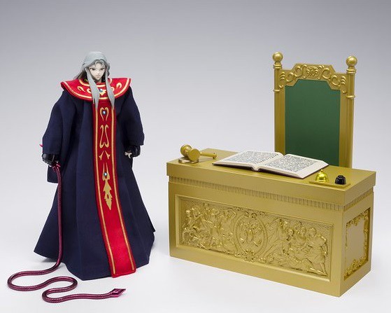 這次的「法庭套裝組合」就是把他的法庭審判服裝以及桌、椅等等配件都附屬其中,審判的服裝是以布料材質來呈現,在書籍法典還附有闔上與打開兩種版本,還有在法庭上維持秩序的"槌"與雙掌合再一起的配件可以替換,完全再現劇中所出現的畫面場景,預算就多的玩具人不仿可以考慮這款豐富的"法庭套裝組",內含有天英星可動人偶、冥衣裝、法庭服與法庭場景、小物等等配件十分超值,此作一樣將於魂web線上商店在2017年1月27日開始接受訂購,喜愛《聖闘士聖衣神話》系列作的玩具人可以參考一下歐!
