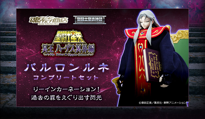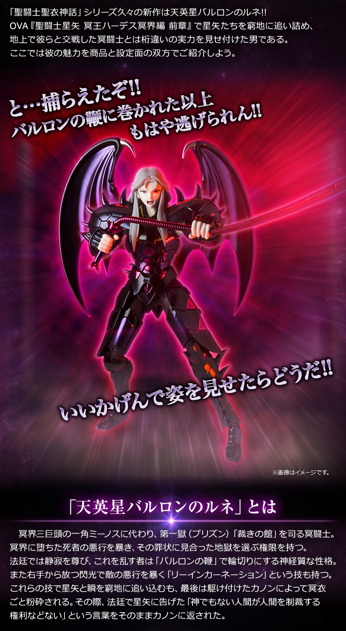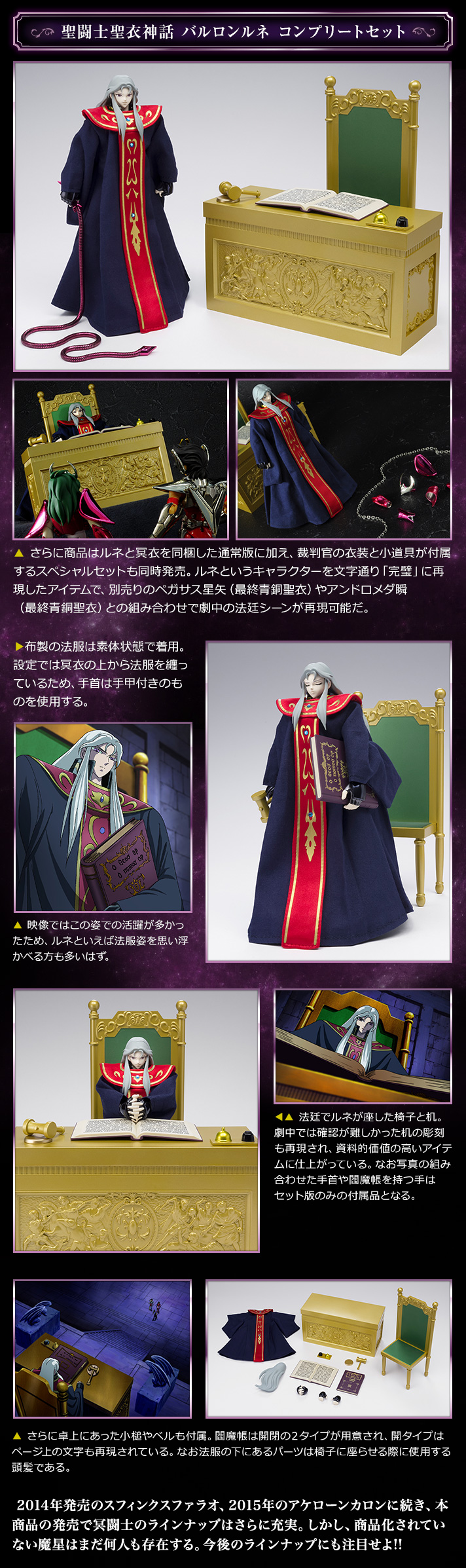 日Bandai萬代玩具公司十分受歡迎的聖鬪士聖衣神話系列,才公開將推出『(聖闘士星矢 冥王哈迪斯篇)聖闘士星矢 冥王ハーデス編』當中所登場的「天英星巴路隆魯尼」,同時也推出了「法庭套裝組合(コンプリートセット)」(名稱暫譯)可以選擇購買,在故事劇中守衛第一獄的"天英星 巴路隆魯尼"有著特殊雙角頭盔造型,也是天貴星"格里芬米諾斯"的代行官,為人喜愛安靜的他相當討厭有任何人在他的法庭中發出任何的噪音。