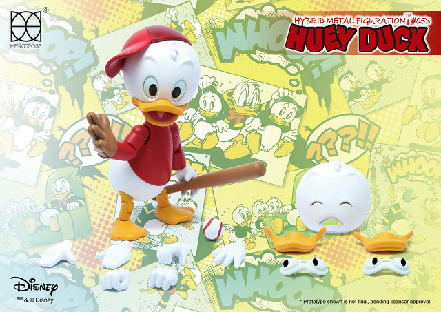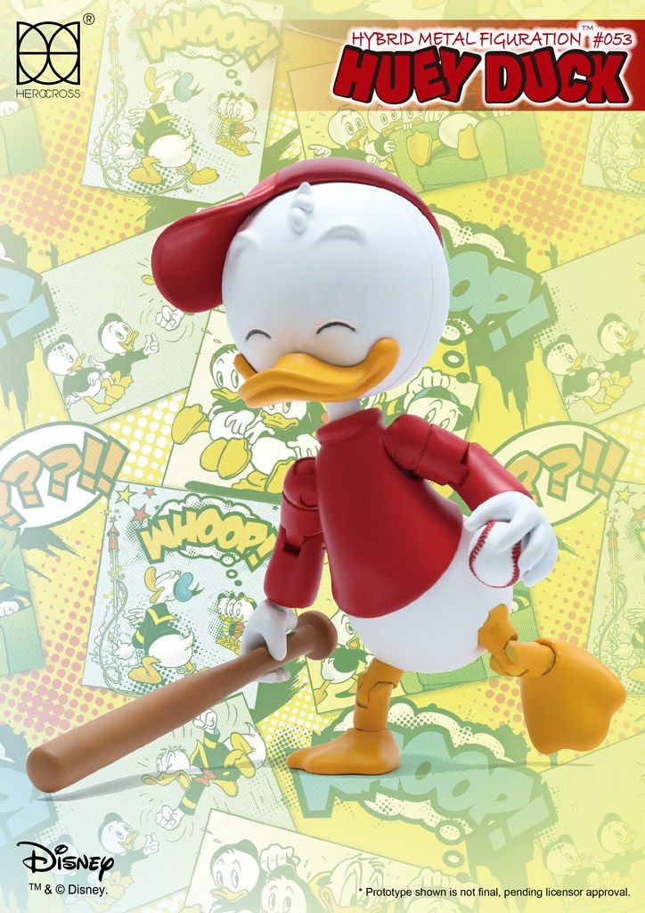 知名合金玩具品牌HEROCROSS 公司繼推出了小熊維尼(Winnie The Pooh)、626 號實驗品史迪奇(Stitch)的作品之後,又將在旗下HMF 系列(Hybrid Metal Figuration)推出迪士尼最著名的人物之一「唐老鴨」(Donald Duck)的三個姪子,而首款就是大哥鴨「輝兒」(Huey Duck)的合金作品。