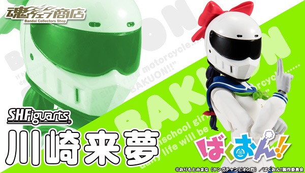 日BANDAI萬代玩具公司的S.H. Figuarts可動系列以人氣動漫《爆音少女!!》為主題,已經公開推出「鈴乃木凜&GSX 400S KATANA」和「佐倉羽音(製服版本)&CB400 SUPER FOUR」與「天野恩紗穿(高校製服)&SEROW225W」還有「三之輪聖+補助輪SUPERCUB(牛的頭蓋骨付屬)」等等四款立體作品,近日官網又公開將繼續推出「川崎來夢(川崎来夢)」的可動商品。