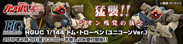 於《機動戰士鋼彈UC》動畫系列所登場的「德姆熱帶型 (獨角獸動畫版本)」ドム・トローペン/Dom Tropen(ユニコーンVer.) 名稱暫譯,劇中是"吉翁公國(ジオンこうこく)"所使用的經典機體之一,這次將以HGUC組裝模型系列來商品化,附有"全新造型手榴彈"在現劇中出現的特殊武器,以及當時所現身攝影機是粉紅色(ピンク)的樣貌,可以替換手首配件與大量豐富武器配件等等,喜愛《機動戰士鋼彈UC》系列動畫的玩具人可以參考一下歐!
