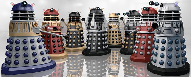 我們在電影中看到許多惡棍,像是佛地魔、索倫、大白鯊、侏羅紀的迅猛龍、金剛、德古拉……Etc等大家耳熟能詳的惡棍,不過我想台灣人比較少知道的是圖中出現的Daleks(達立克族)。