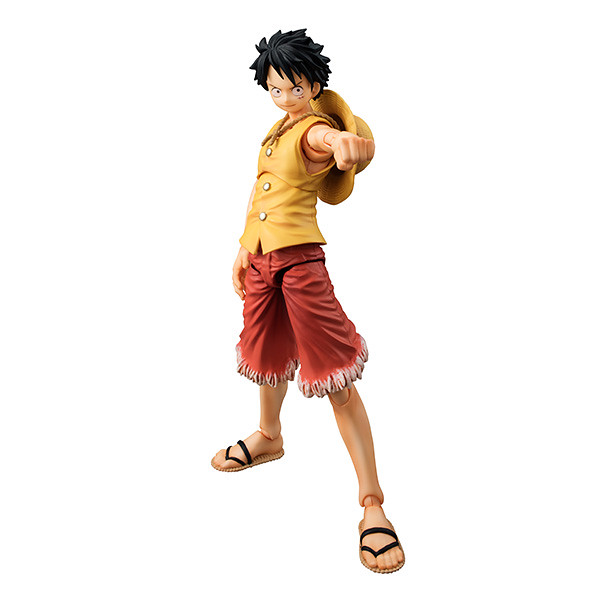 這次的最新作品《海賊王》蒙其·D·魯夫 PAST BLUE (Ver.Yellow),將以「頂上戰爭」2年前的姿態來立體化。草帽可自由穿脫、並附有三種不同的表情零件與各種手勢替換零件可供交換,並附有魯夫豪邁大吃代表的道具「帶骨肉」作為配件,搭配其它「VARIABLE ACTION HEROES」登場的角色讓可玩性更加提升~ 除此之外,本作品初回特典將贈送能夠重現原作世界觀的「狀聲字」配件。
