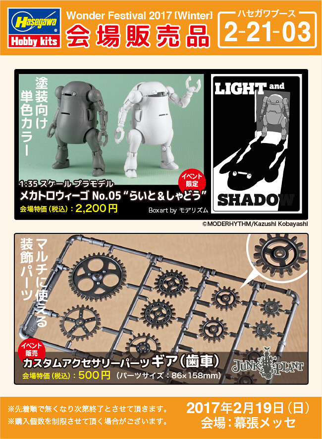 3DCG建模師也是原型師小林和史所設計的35機動機器人WeGo「35Mechatro WeGo」,相當受到喜愛機械題材的玩具人喜愛,之前由「長谷川」玩具公司所推出過的"1/35比例組裝模型"與"東雲研究所ver."都深受模型玩具人的歡迎,這次將於這個月舉辦的WF2017(冬)展覽限定推出其系列的“光與黑影(らいと&しゃどう)” 白色和深灰暗影特殊配色的版本。