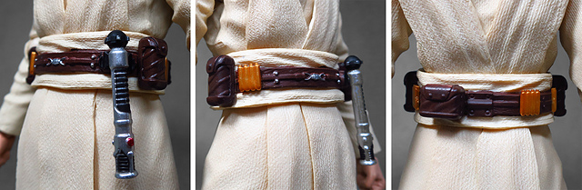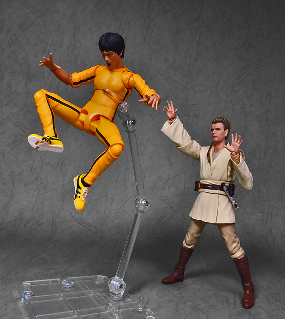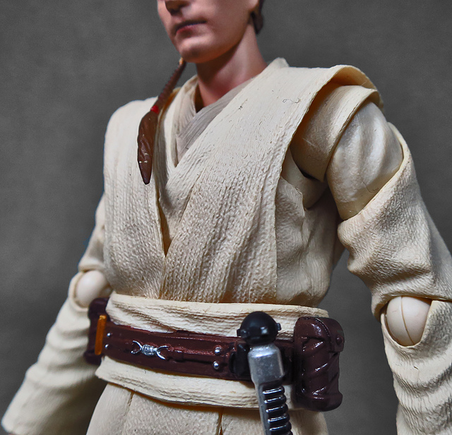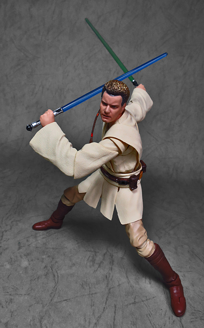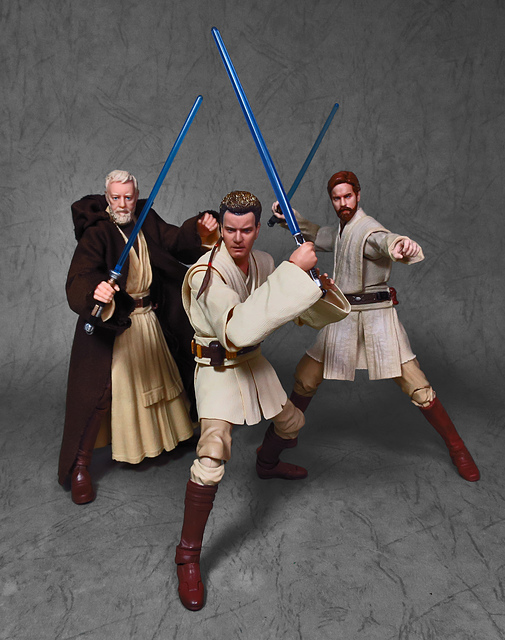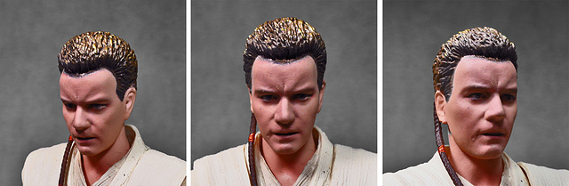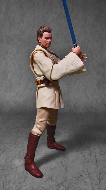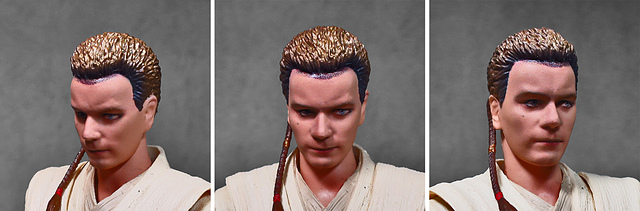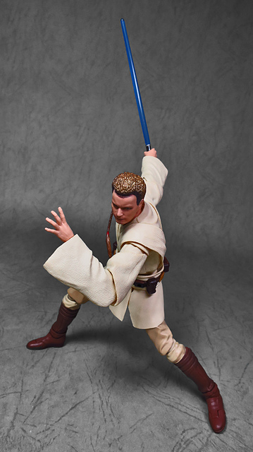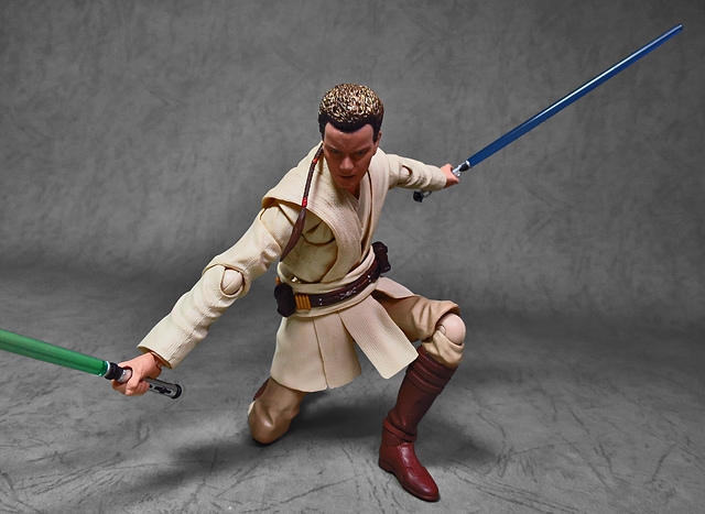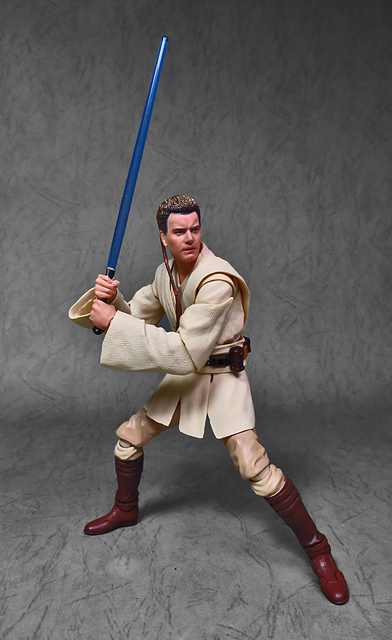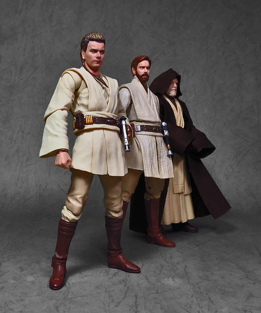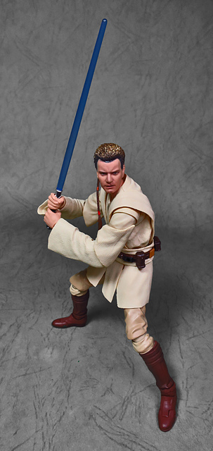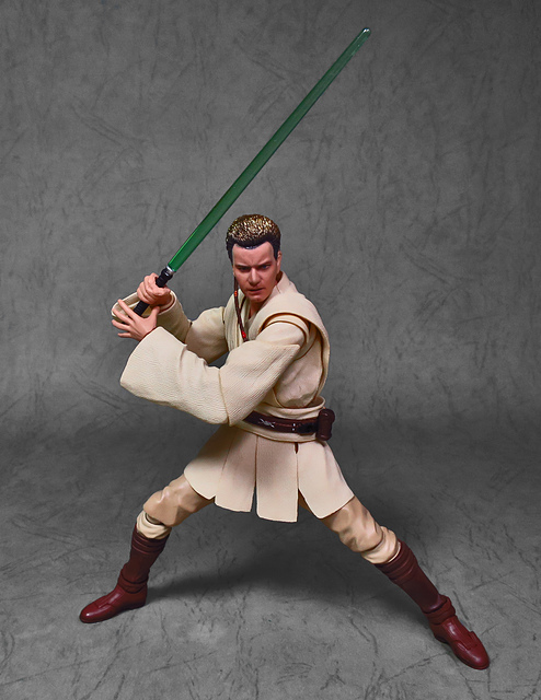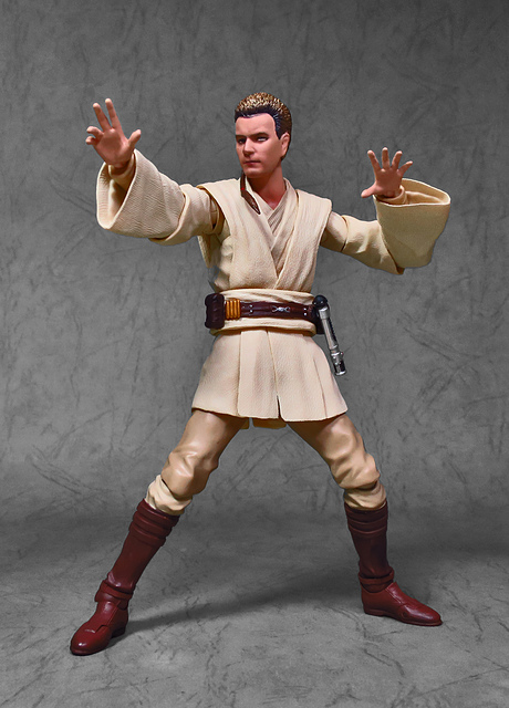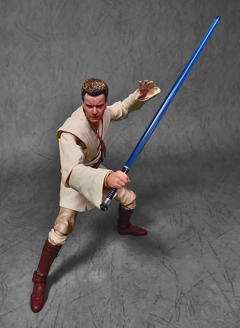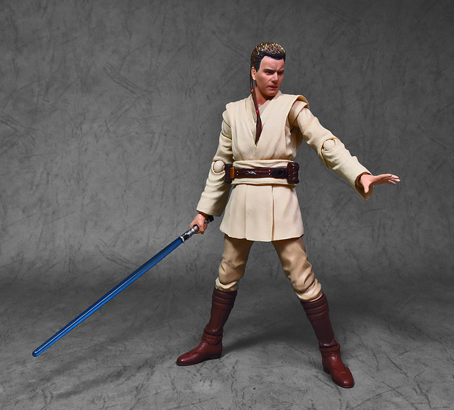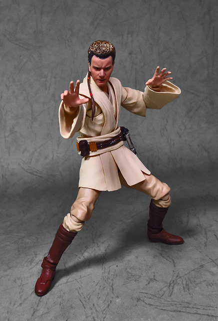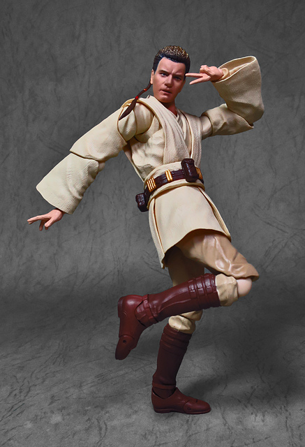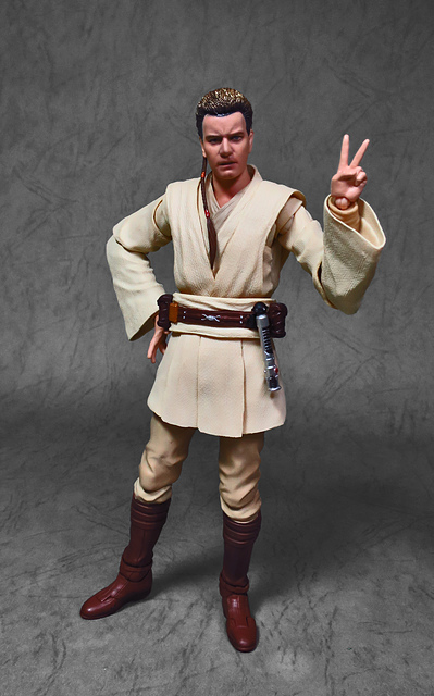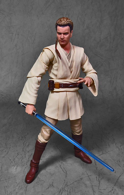 那麼,讓我們回到玩具這個主題,萬代的S.H.Figuarts系列,近年來已儼然成為日系可動人偶的龍頭之一,題材涵蓋的範圍之廣,無所不包,從動漫人物來到真人電影通通都是其守備範圍,而後者在導入了魂數位上色技術的輔助後,等同將過去僅能在十二吋的大比例才能精確表現的真人頭雕,微縮至一半的六吋,單以頭雕的完成度而言,絕對是完勝Hasbro的黑標系列(The Black Series),高擬真的表現也成了該系列最強的優勢,這款歐比王,雖然僅附有兩顆頭雕,但是兩種表情均有著驚人的還原度,甚至演員伊旺‧麥奎格(Ewan Gordon McGregor)右臉的痣也精確再現,用心程度可見一般,而絕地武士獨特的多層次外衫,也藉由不同厚度的塑料材質表現,和黑標的真實布料可說是各有千秋,雖然在配件行頭稱不上是華麗,但本體的可玩性已讓人十分滿意,如果條件允許,還真的會讓人想把EP2、甚至是都還沒消息的EP3版都收齊,在這裡只能再一次地感嘆:星戰的坑、果然就跟宇宙一樣浩翰無垠吶(仰頭)~!