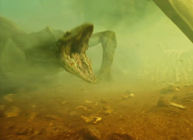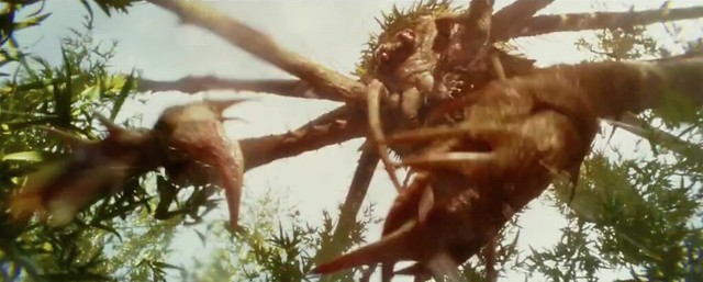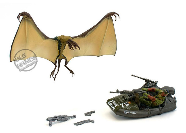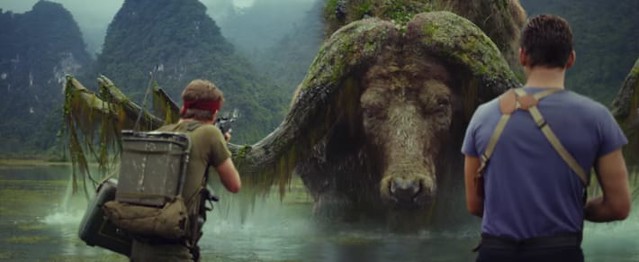 至於其他還沒有詳細設定怪物,可以透過玩具、預告片和設定圖,我們知道有巨大的水牛,看來應該是最溫馴的怪獸。還有類似翼龍的生物如圖中湯姆·希德斯頓飾演的詹姆士·康拉德上尉正在拿刀砍,還有玩具透露出是跟人類差不多大小。