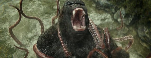巨型章魚目前只透過預告片看到觸手而已,本體可能要等電影正片才會看到,但有很多人娜悶為何出現巨大章魚會讓怪獸迷那麼狂喜。因為當年的金剛系列作中,只有金剛大戰哥吉拉這部電影,才有出現巨大章魚,加上2020年哥吉拉又要跟金剛大戰一次,所以這怪獸的出現,等於是相關文化的眾多致敬之一。