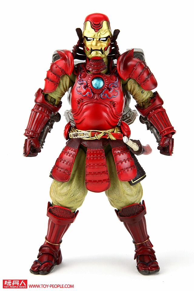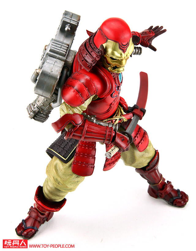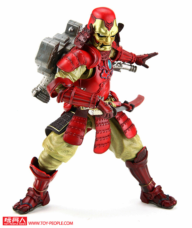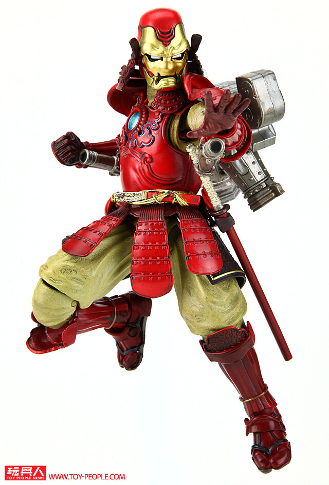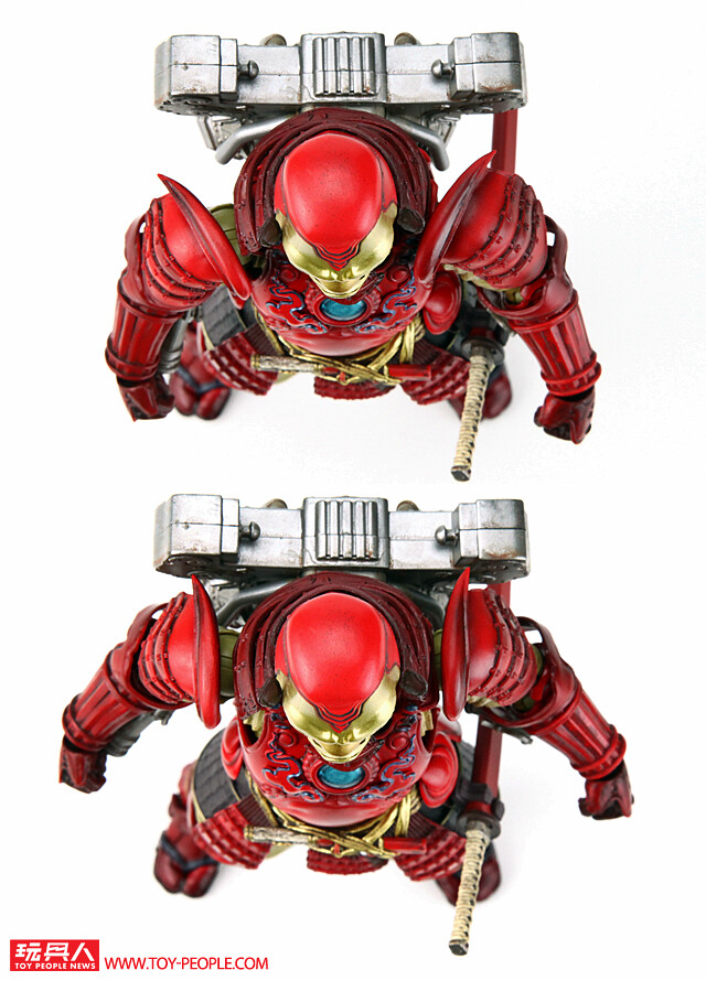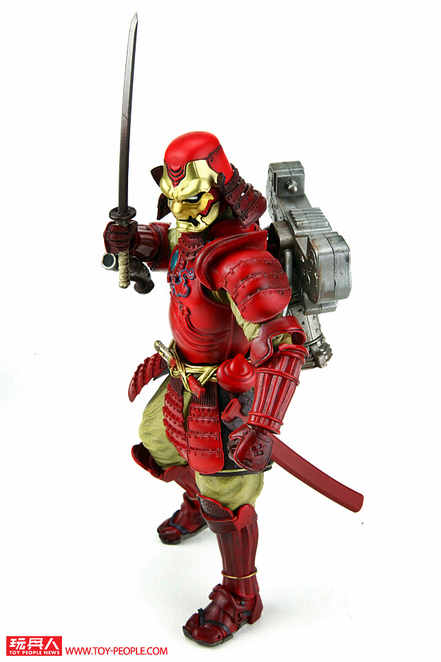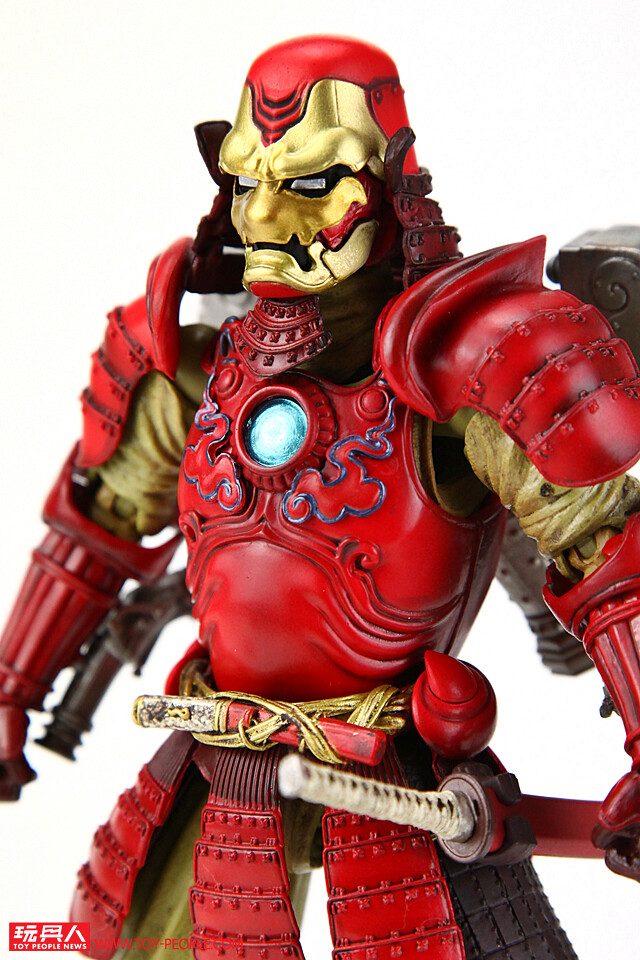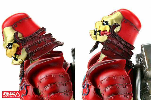 ▼ 接著來欣賞一下本體的造型吧! 以鋼鐵人招牌的紅色金色作為基礎,轉化為朱紅色的胴甲,並以日本傳統的鎧甲造型重新詮釋鋼鐵人的裝甲,東西洋風格混合超酷的! 除此之外,全身的鎧甲更施以了舊化的塗裝,更為造型增添逼真、寫實的氣息。