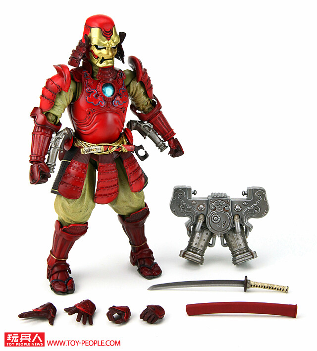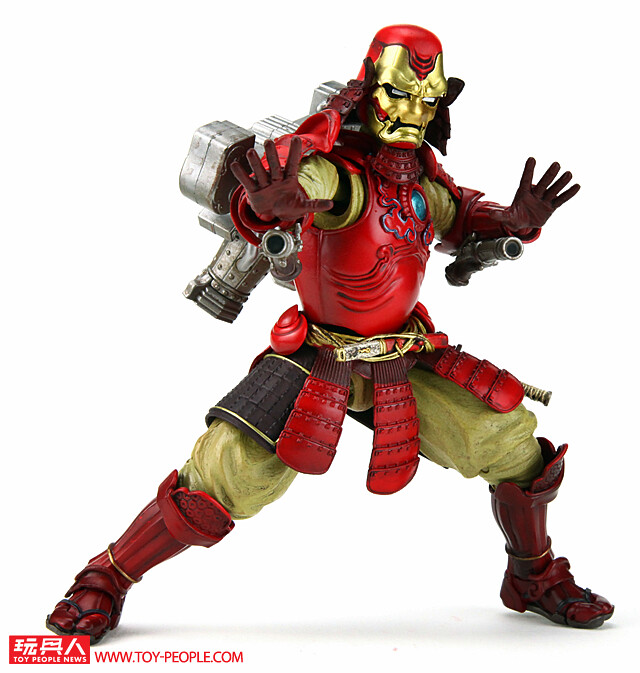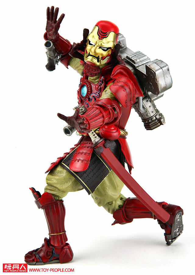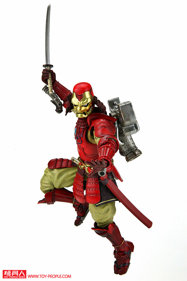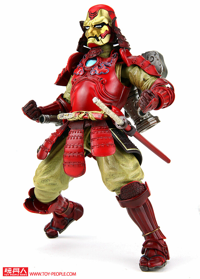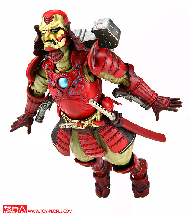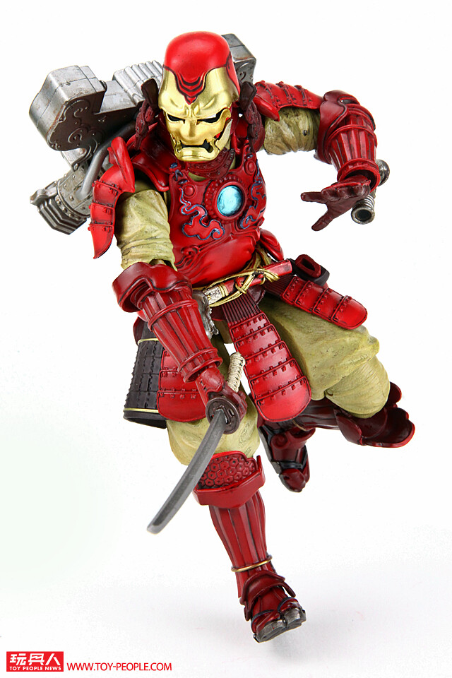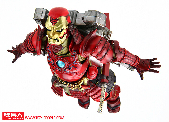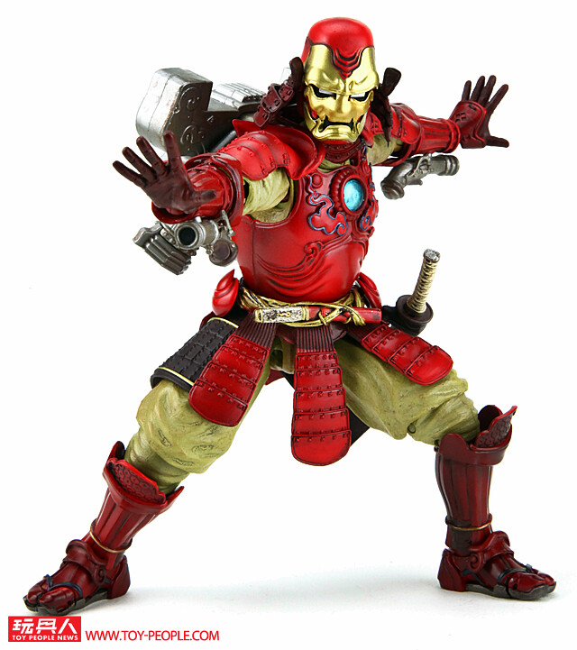 ▼ 接著來欣賞一下本體的造型吧! 以鋼鐵人招牌的紅色金色作為基礎,轉化為朱紅色的胴甲,並以日本傳統的鎧甲造型重新詮釋鋼鐵人的裝甲,東西洋風格混合超酷的! 除此之外,全身的鎧甲更施以了舊化的塗裝,更為造型增添逼真、寫實的氣息。
