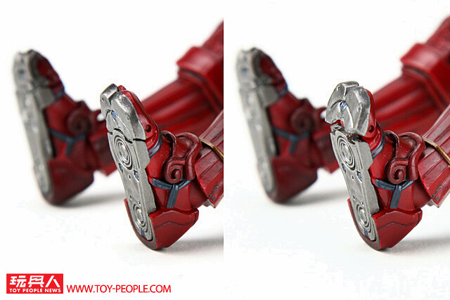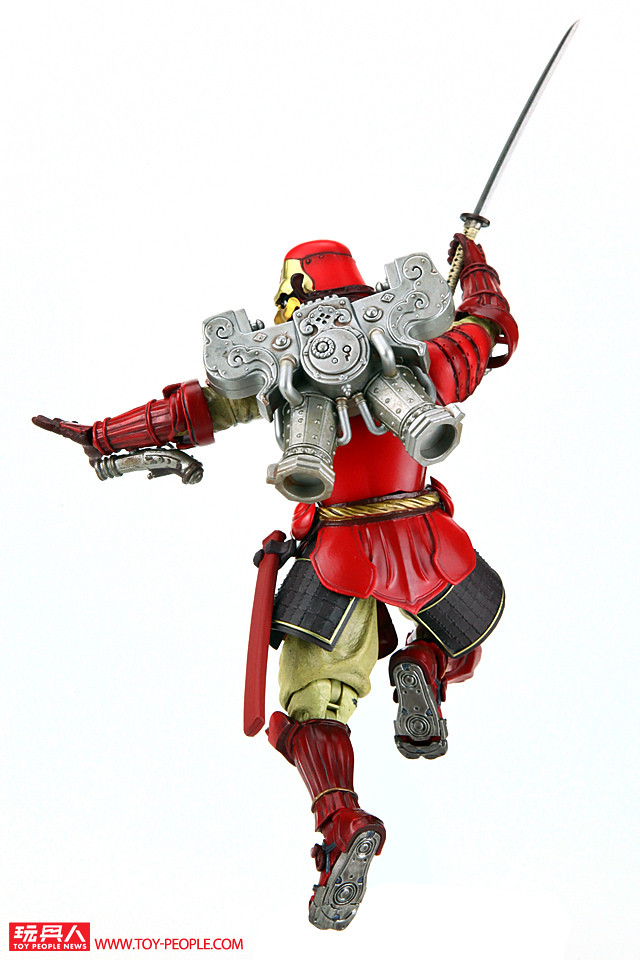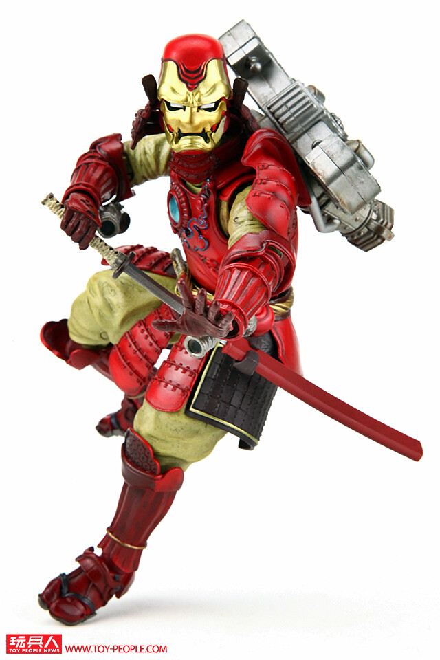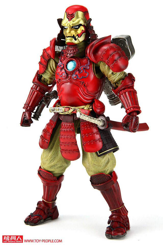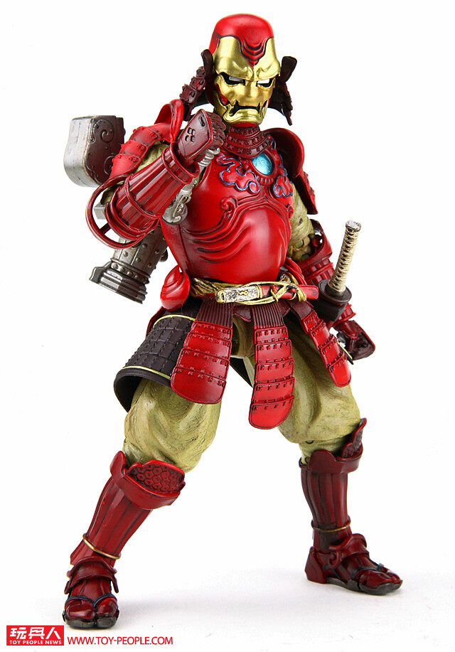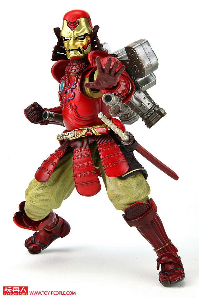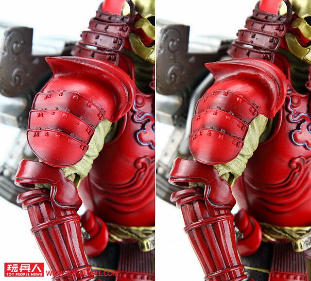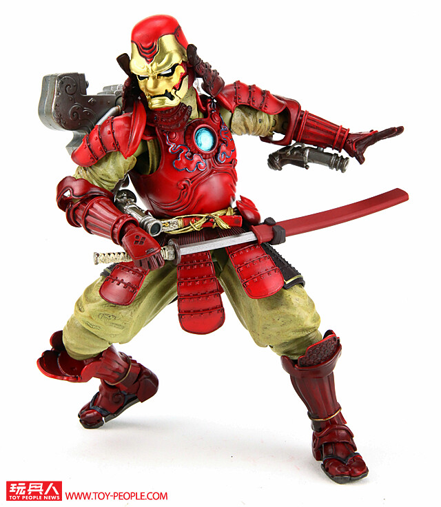 ▼ 接著來欣賞一下本體的造型吧! 以鋼鐵人招牌的紅色金色作為基礎,轉化為朱紅色的胴甲,並以日本傳統的鎧甲造型重新詮釋鋼鐵人的裝甲,東西洋風格混合超酷的! 除此之外,全身的鎧甲更施以了舊化的塗裝,更為造型增添逼真、寫實的氣息。