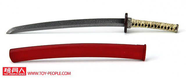 ▼ 配件的武士刀。 握把上施以舊化塗裝,呈現其身經百戰的模樣;刀身上也使用了金屬塗裝呈現其質感。 武士刀收入刀鞘時的密合度也做的很好,不會因為太鬆而導致把玩時(或飛行型態時)武士刀滑出、也不會因太緊而讓刀身上的塗裝被磨損。