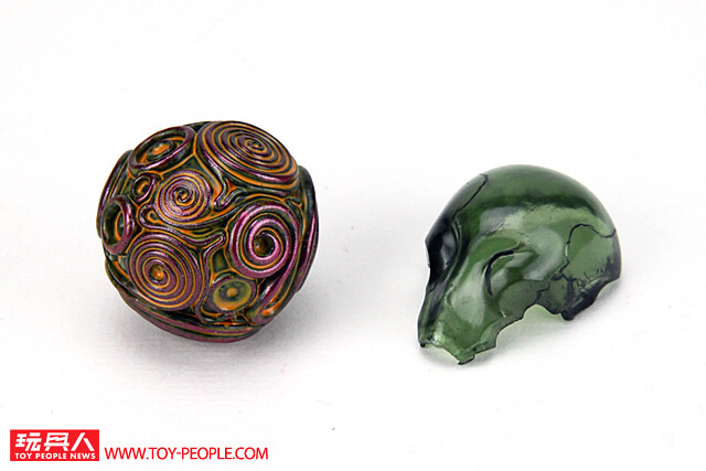 ▼ 配件附屬了一個特殊造型的螺旋球狀物,以及特殊的綠色透明面罩。 銅綠色為基底的球體上纏繞著無數大小不一的螺旋圖樣,螺旋上的金屬光澤紫紅配色,彷彿閃耀著妖異的光芒,散發著詭異氣息。 綠色面罩則是除了綠色配色之外,也施以了污損的質感。