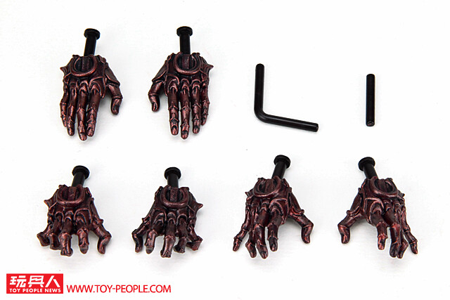 ▼ 除了本體的握拳手之外,另外還附有三對不同的手部造型,充滿力道的手勢能夠為本體的姿勢更加增添生動效果。 另外還附有兩個將球狀物配件組合在手上的支柱。 手勢零件上的黑色插梢,是為了防止軟性材質的手部零件變形,導致手部零件不容易組合所使用。 建議平時不使用時可以保持插入的狀態,手部零件才不容易變形。