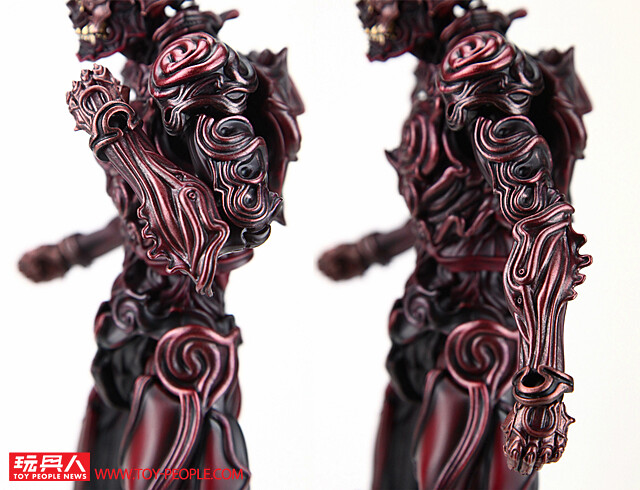 ▼ 手臂上燕脂色部分,塗裝了暗色與亮面的金屬配色,這樣相互對比下,讓人偶的造型線條更加被強化,更加具有立體層次感。
