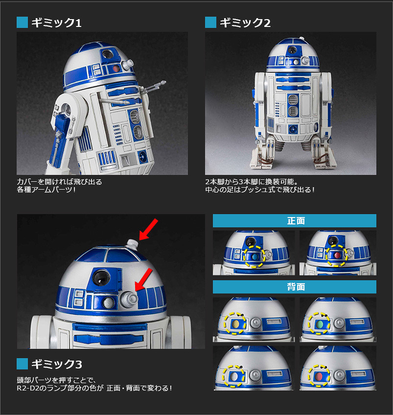 R2-D2 也是貫穿了星際大戰電影系列作品的重要角色之一,更是唯一一個在所有作品中都使用同一個形象登場的角色。而這次S.H.Figuarts 系列則是要推出來自電影星際大戰四部曲:曙光乍現中登場的造型,除了在塗裝的部分非常細膩之外,可動的效果也是相當不錯呢!還可以呈現出兩腳、三腳的造型;而頭部還有設計按鈕可以呈現面板變換顏色的效果。