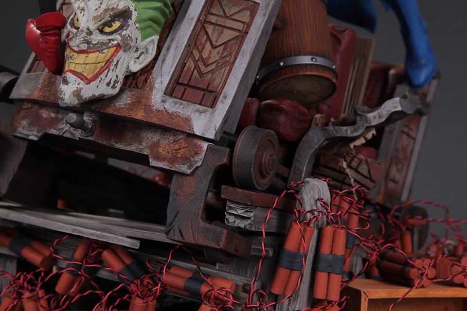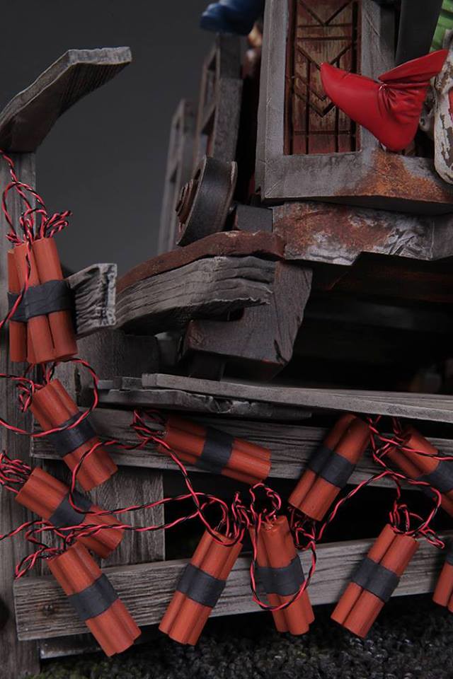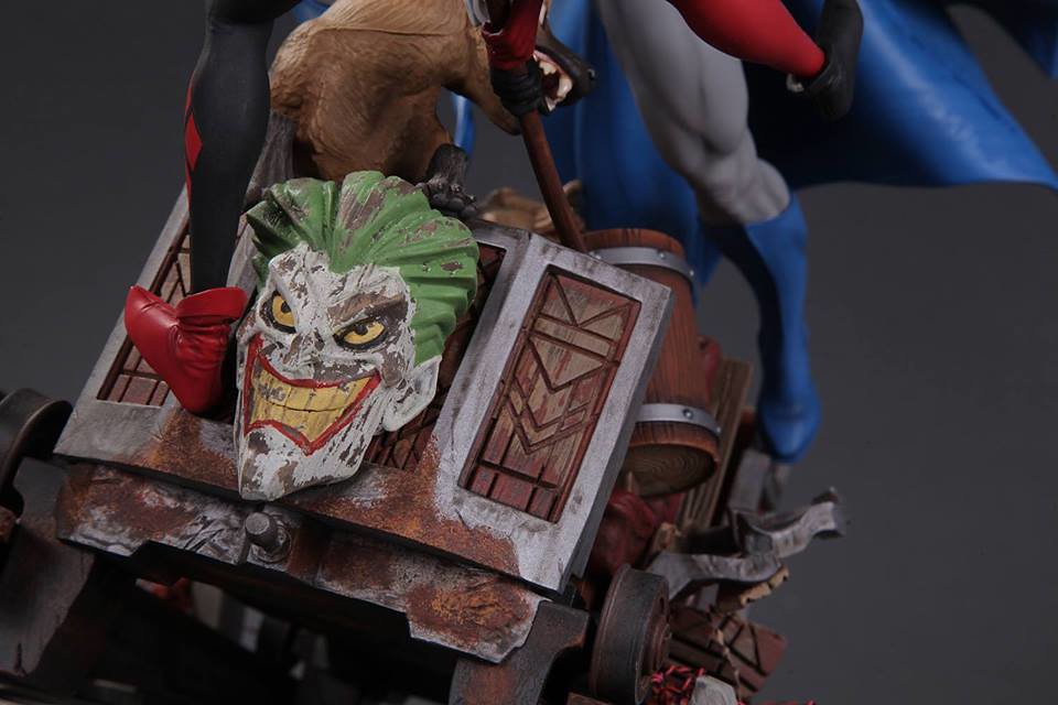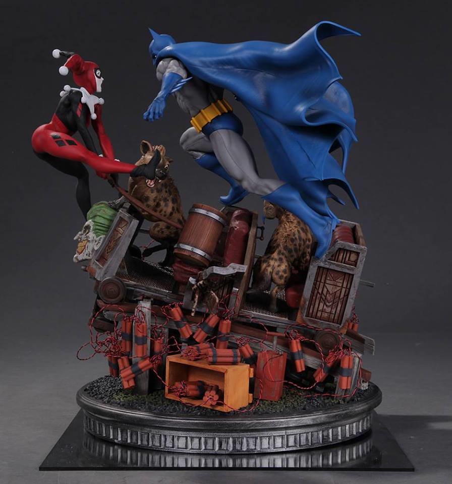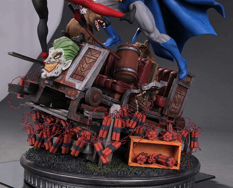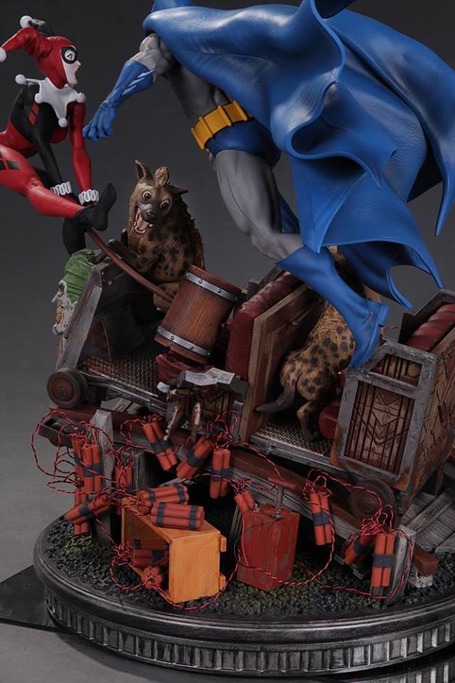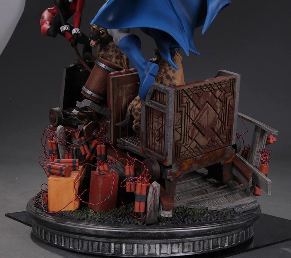 整體的戰鬥雕像場景圍繞著藍色、灰色漫畫版本的蝙蝠俠(Batman)以及拿著大木槌的小丑女哈利·奎恩;兩人站在綁滿炸彈的軌道列車上打鬥,而軌道列車上還有兩隻豺狼,而車頭則是有小丑的頭像。小編覺得這應該是要像在2000 年DC Comics 所推出小丑女專屬系列第一集All Aboard--The Roller Coaster of Love! 致敬,而兩隻豺狼則是在第九集的封面出現過,喜愛小丑女的玩具人別錯過囉。