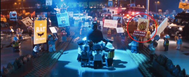 為了表達跟上一部樂高玩電影是同一個宇宙,所以當科學家講述小丑的炸彈會把高譚市弄裂,原因是建立在兩個脆弱的版塊(指樂高積木)。接著提到人們會掉入深淵裡時採用的畫面,就是樂高玩電影主角艾密特到現實世界的場景。附帶一提,下一部樂高電影宇宙作品是旋風忍者~