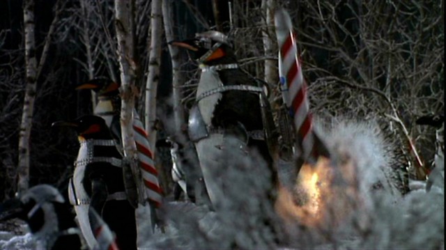 當電影介紹到企鵝這位惡棍時,他的手下企鵝也跟著出動,穿的火箭服裝就是參考提姆波頓的第二集電影。