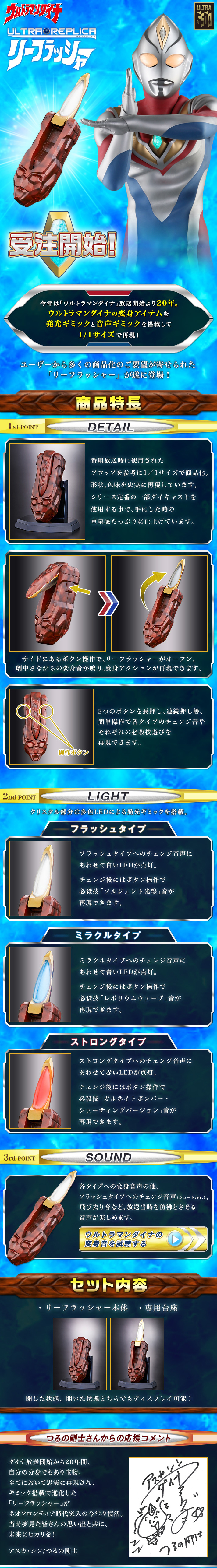 「ULTRA REPLICA 超人力霸王帝納變身器 LIEFLASHER」以1:1的實物比例製成,並且大幅還原了當時劇中使用的道具,讓LIEFLASHER木雕般的造型與色彩都忠實再現。此外一部份的零件使用了合金材質,拿起變身器時更有沉甸甸的真實感。展開後的水晶中有著細緻的紋路,外圍則以電鍍金上色增加質感。
