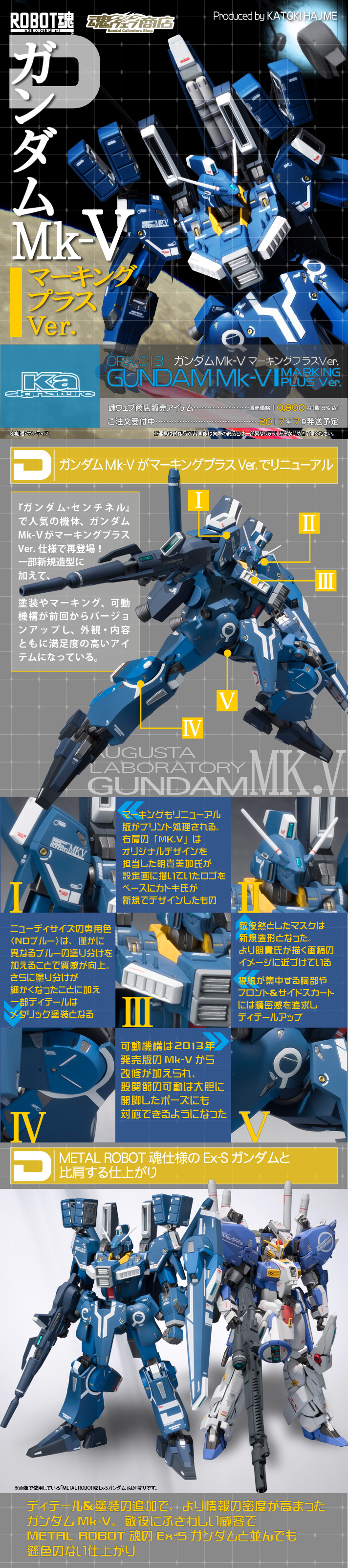 這次推出的「ROBOT魂(Ka signature) 〈SIDE MS〉 鋼彈Mk-V Marking Plus ver.」不僅僅是將2013年發售的版本上過水貼重新推出,在造型、塗裝甚至可動範圍都經過優化。頭部的面罩、胸部裝甲的細節大幅更新,造型更加銳利、精密。藍色裝甲使用不同深淺的色塊塗裝,細部的散熱孔等部位也使以金屬色塗裝,提昇層次與資訊量,即使和METAL ROBOT魂系列相比也毫不遜色。股關節經過修改後能做出更大幅度的開腳姿勢。