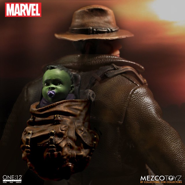 這次的作品,MEZCO 以One:12 Collective 系列的獨特風格,重新詮釋了老人羅根的造型,並附屬了皮大衣、可自由穿脫的帽子與背包、多款手部替換零件,以及消滅所有浩克幫之後,羅根僅存下來希望他能夠成為新一代超級英雄的浩克寶寶“小布魯斯”(Bruce Jr.)。豐富充實的配件,搭配上布料製作的服飾,為造型更加增添質感,絕對是喜愛金鋼狼的粉絲們必備的獨特收藏!