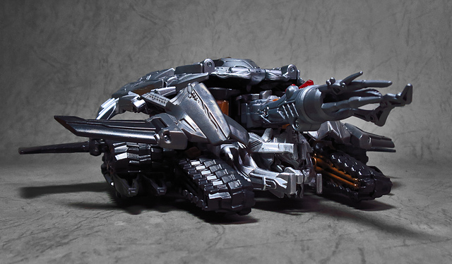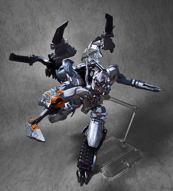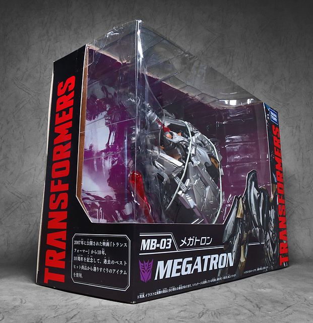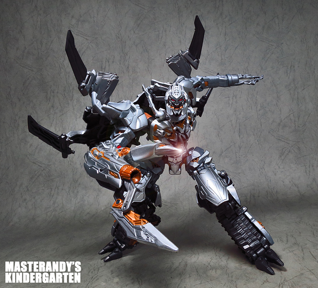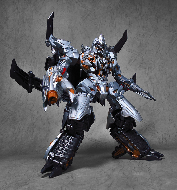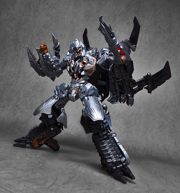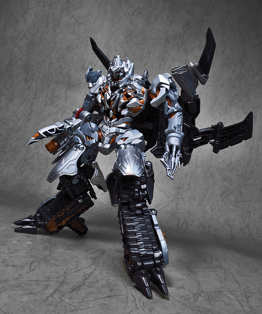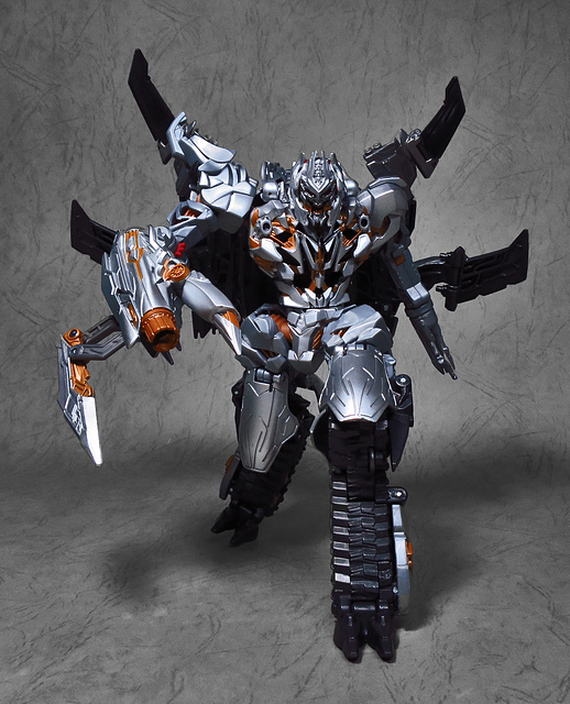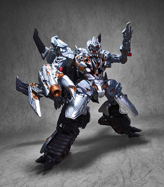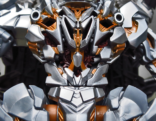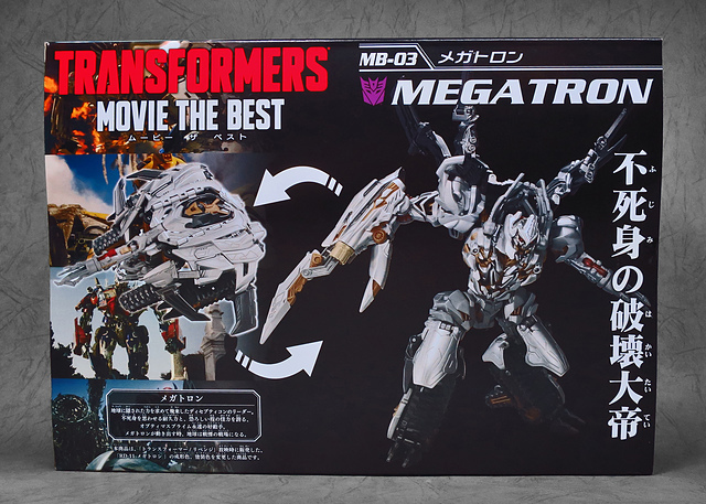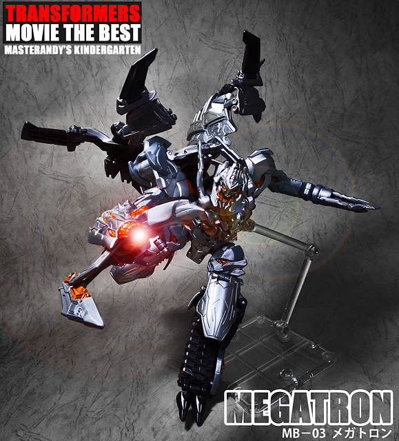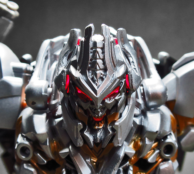 在新電影上映的前夕端出過去的產品重塗複刻,可真是一道讓人左右為難的前菜。在真人電影第四集《絕跡重生》(Transformers: Age of Extinction,以下簡稱為AOE)正式上映前,Takara Tomy社即運用過這樣的手法,將過去的佳作以「Movie Advanced Series」之名加以重新包裝,大概是因為喜歡的都早已入手,當時的我對這招可說是完全免疫,但萬萬沒想到,搭著新電影第五集《最終騎士》(Transformers: The Last Knight,以下簡稱為TLK)的潮流,TT社又再度以類似的手法對玩家們的荷包進行搶攻,將這個前奏系列定名為「Movie the Best」,同樣收錄四集電影的精華之作,這次,我的荷包也只好順理成章地失守了。一度錯過的《復仇之戰》(Transformers: Revenge of the Fallen)V級Megatron,這次居然回歸破壞大帝的霸王本色-銀色,一來是配色實在是誘人,二來也是衝著未曾玩過的新鮮感使然,最後還是不爭氣地屈服,這款被玩家們戲稱為「龜殼密」的V級Megatron,係延用自ROTF的玩具產線,被玩家們視作真人電影玩具系列、那個回不去的黃金時代,份量紮實,變形和連動機關也充滿了樂趣,或許尺寸帶來的爽感比不上L級,但我真心覺得這款V級的體態更讓我滿意,接下來,還是請各位觀賞這銀光閃閃的照片吧!