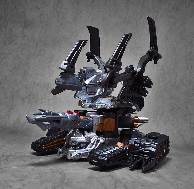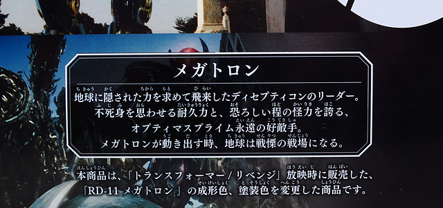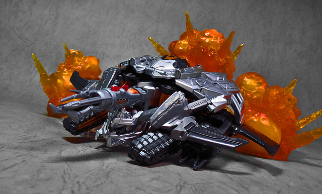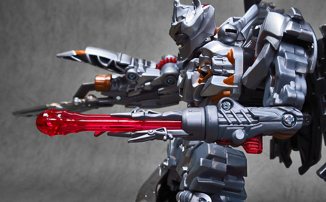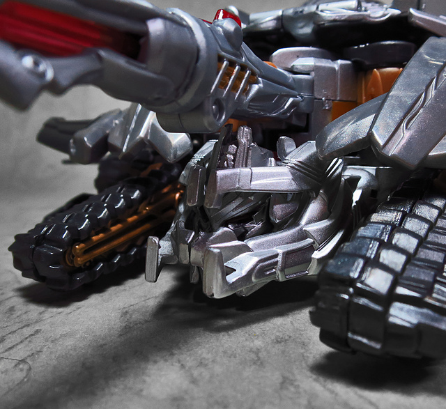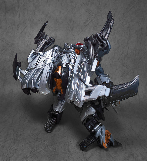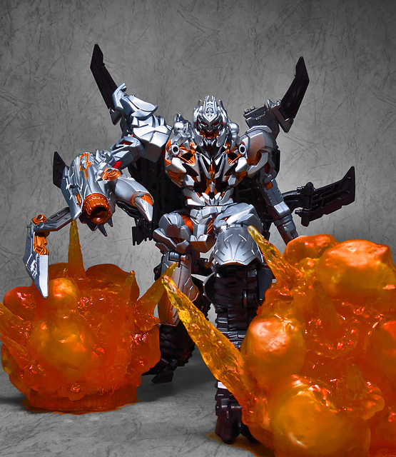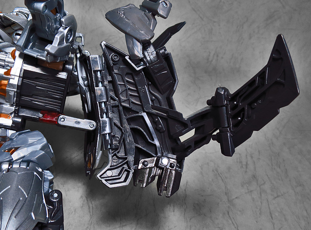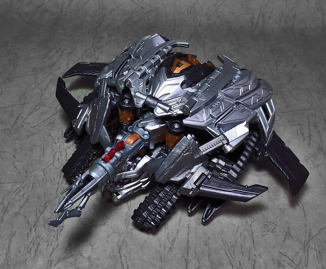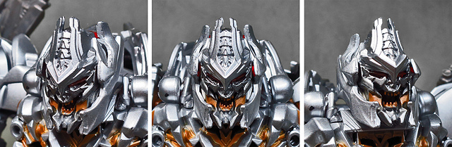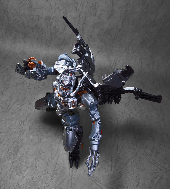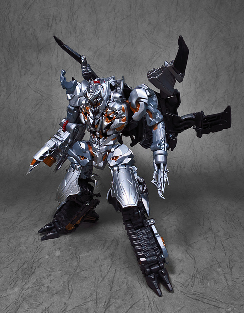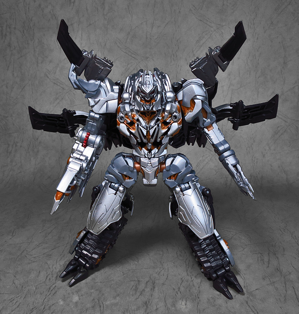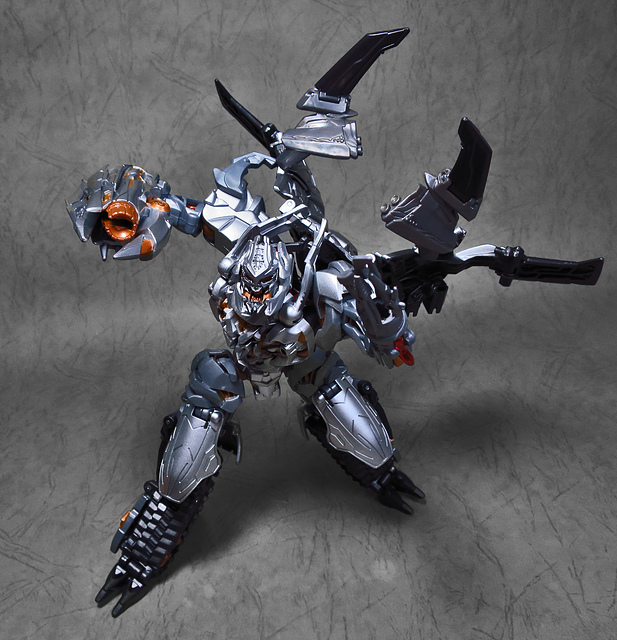 在新電影上映的前夕端出過去的產品重塗複刻,可真是一道讓人左右為難的前菜。在真人電影第四集《絕跡重生》(Transformers: Age of Extinction,以下簡稱為AOE)正式上映前,Takara Tomy社即運用過這樣的手法,將過去的佳作以「Movie Advanced Series」之名加以重新包裝,大概是因為喜歡的都早已入手,當時的我對這招可說是完全免疫,但萬萬沒想到,搭著新電影第五集《最終騎士》(Transformers: The Last Knight,以下簡稱為TLK)的潮流,TT社又再度以類似的手法對玩家們的荷包進行搶攻,將這個前奏系列定名為「Movie the Best」,同樣收錄四集電影的精華之作,這次,我的荷包也只好順理成章地失守了。一度錯過的《復仇之戰》(Transformers: Revenge of the Fallen)V級Megatron,這次居然回歸破壞大帝的霸王本色-銀色,一來是配色實在是誘人,二來也是衝著未曾玩過的新鮮感使然,最後還是不爭氣地屈服,這款被玩家們戲稱為「龜殼密」的V級Megatron,係延用自ROTF的玩具產線,被玩家們視作真人電影玩具系列、那個回不去的黃金時代,份量紮實,變形和連動機關也充滿了樂趣,或許尺寸帶來的爽感比不上L級,但我真心覺得這款V級的體態更讓我滿意,接下來,還是請各位觀賞這銀光閃閃的照片吧!