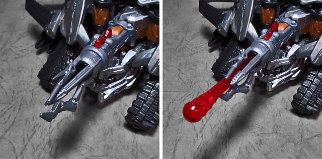 ↓右手的融合加農會和肘關節連動,手臂伸直時會展開刺刀,大螯部則可以手動調整角度