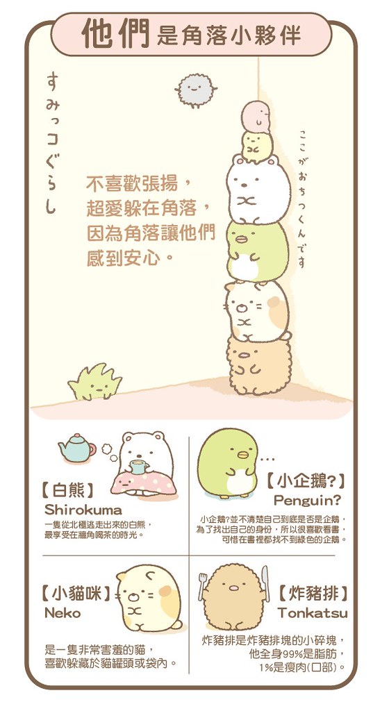 《角落小夥伴》すみっコぐらし是專門經營卡通IP的San-X公司繼"懶懶熊"、"深情馬戲團"等等療癒系角色後,所推出的可愛又賣萌的生物「すみっコぐらし」,台灣地區是以"角落小夥伴"為其翻譯的名稱,香港地區則是翻譯成「角落生物」的名稱,也有人叫他們是"角落玩偶"等等名字,這些生物有白熊、小企鵝、炸豬排、小貓咪、珍珠和雜草,他們的因為角落總讓人有安全感,所以小夥伴們會疊在一起共享角落,歡迎找一面牆角,一起加入小夥伴們的角落生活。