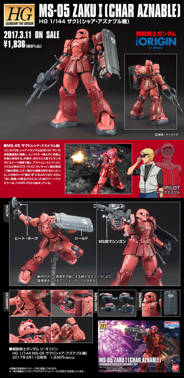 日Bandai萬代玩具公司的HG組裝模型模型系列這個月份將推出《機動戰士鋼彈 THE ORIGIN》動畫當中所登場的「薩克I(夏亞·阿茲納布爾機)」ザクI (シャア・アズナブル機),「夏亞」在動畫系列裡面身兼MS駕駛員、指揮官、思想家等等多種的身份,能力相當強大,在《THE ORIGIN》裡面有更多詳細描寫的身世之謎與其系列故事的一開始,這次的「薩克I」以紅色塗裝來呈現,機體上的紅色以不同彩度的紅色來表現其層次,喜愛《機動戰士鋼彈 THE ORIGIN》系列動畫的玩具人可以參考一下歐。