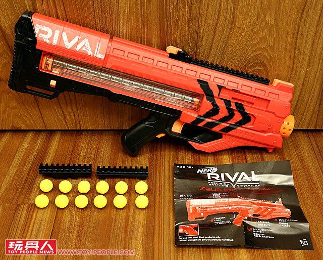 ▼ 內容物一覽:宙斯XV1200發射器本體、兩片戰術軌道片、12顆球彈、長型球彈專用彈匣(12發)與說明書。