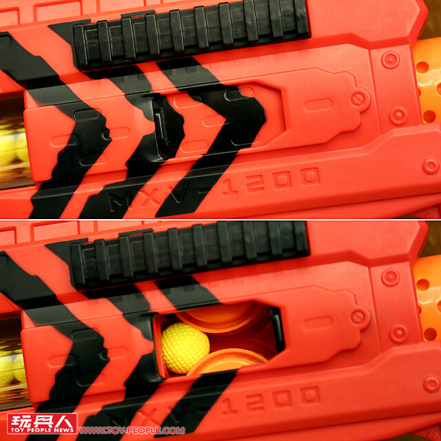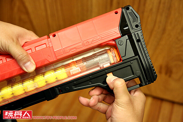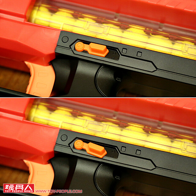 ▼ 由於這個系列擁有NERF 系列史上最強的射擊力與射速,所以為了安全起見,特別設計了雙向保險開關。 只要按下槍身右側(左側就會凸起)的保險開關,就能解除保險擊發;將左側的保險開關按下(向右側凸起),就能鎖住扳機避免誤擊。