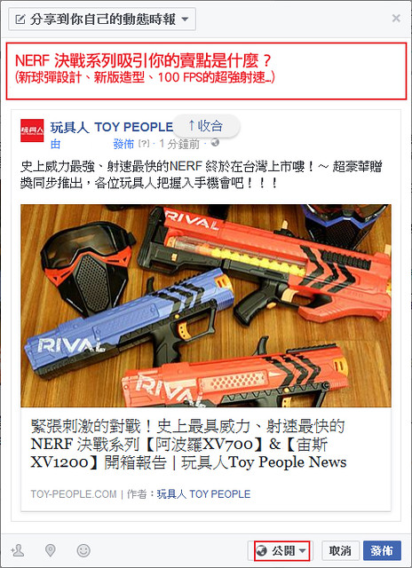 2. 將連結分享到你個人的Facebook 塗鴉牆,請寫下回答“NERF 決戰系列吸引你的賣點是什麼?(新球彈設計、新版造型、100 FPS的超強射速)”(權限記得要設定成公開,不然小編無法檢查你是否貼文,那就無法中獎嘍~)